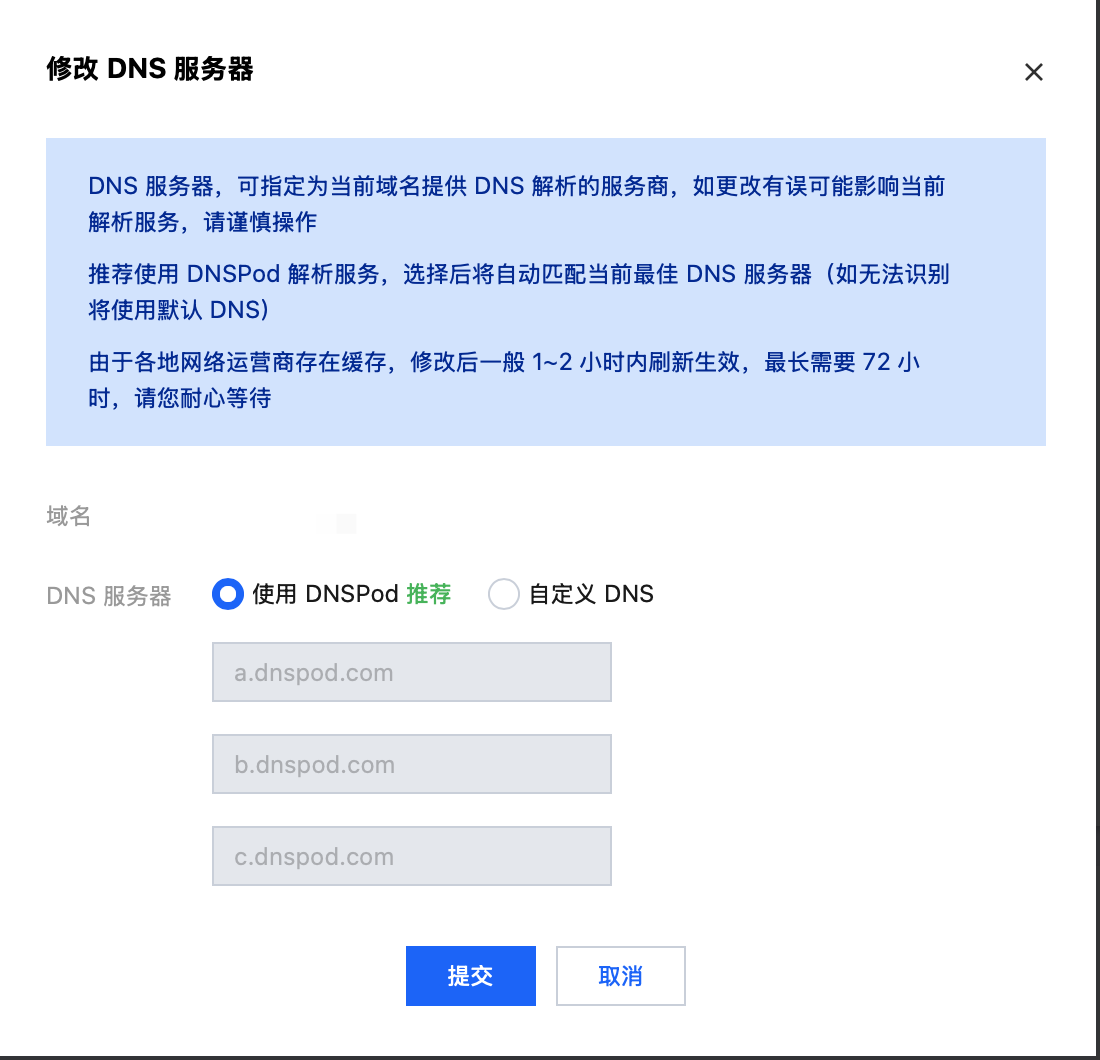 如果域名在腾讯云注册,或者已转入腾讯云,可以通过以下步骤修改 DNS 服务器: