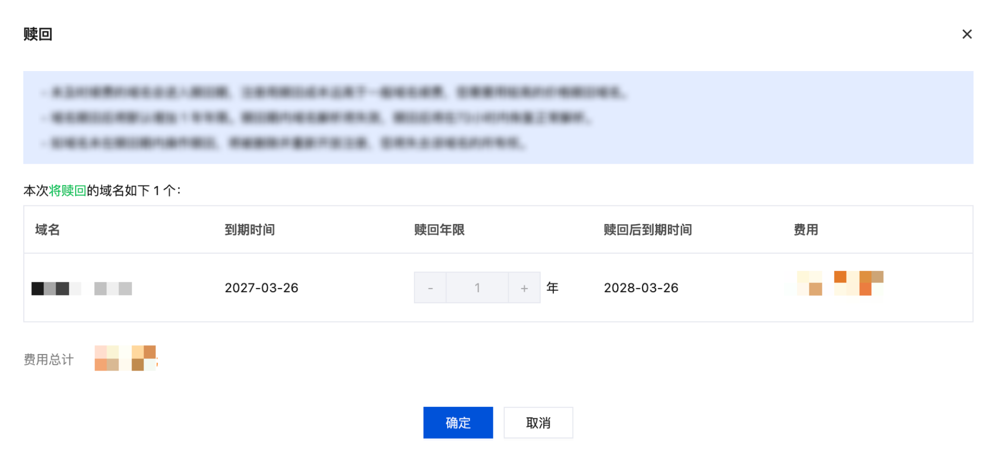 3. 确认域名信息及域名赎回金额,单击确定,并支付域名赎回的费用,即可完成域名赎回。