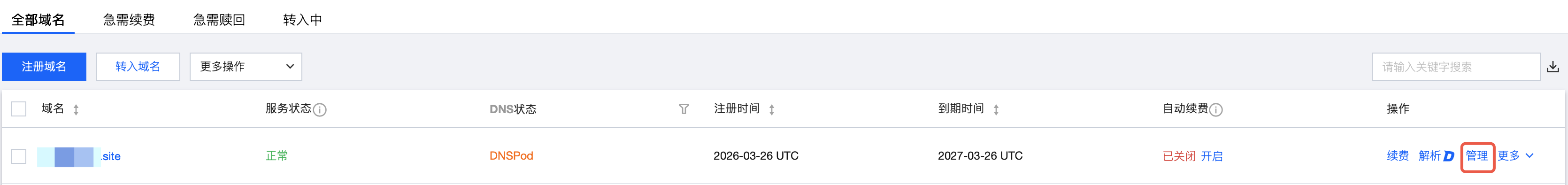 2. 在待域名转出的域名行中,单击管理。如下图所示: