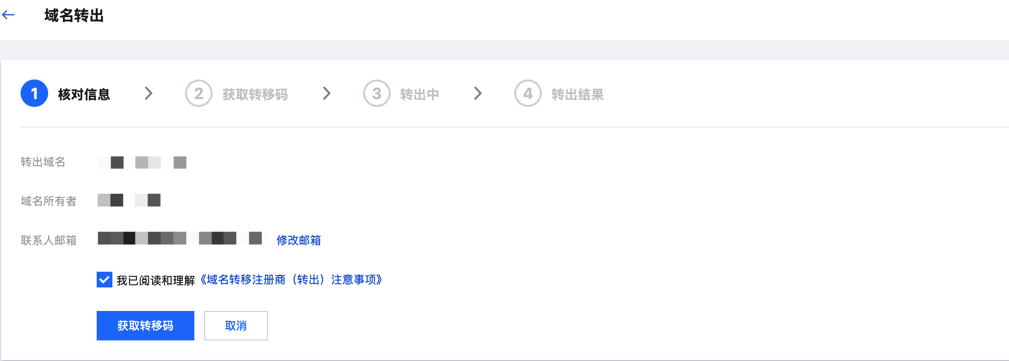 域名转出之前请确认是否已关闭禁止转移锁,若已开启,则无法转出,您需要先关闭禁止转移锁再进行域名转出。具体操作请参考 开启域名安全保护。 4. 在域名转出页面,核对邮箱,阅读并勾选 “我已阅读和理解《域名转移注册商(转出)注意事项》”,并单击获取转移码。如下图所示: