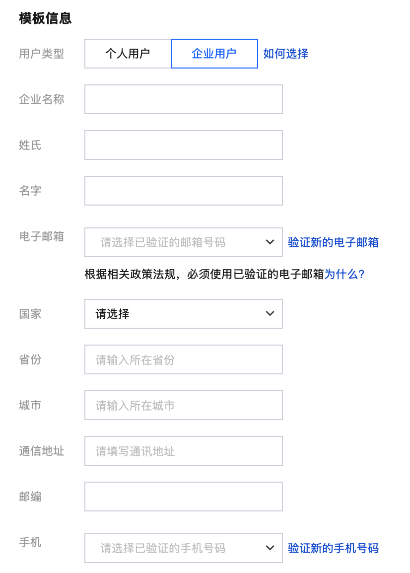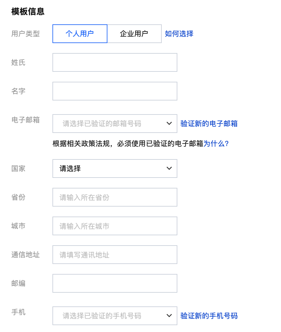 3. 域名信息模板分为两种用户类型:个人用户和企业用户。请根据实际进行选择。