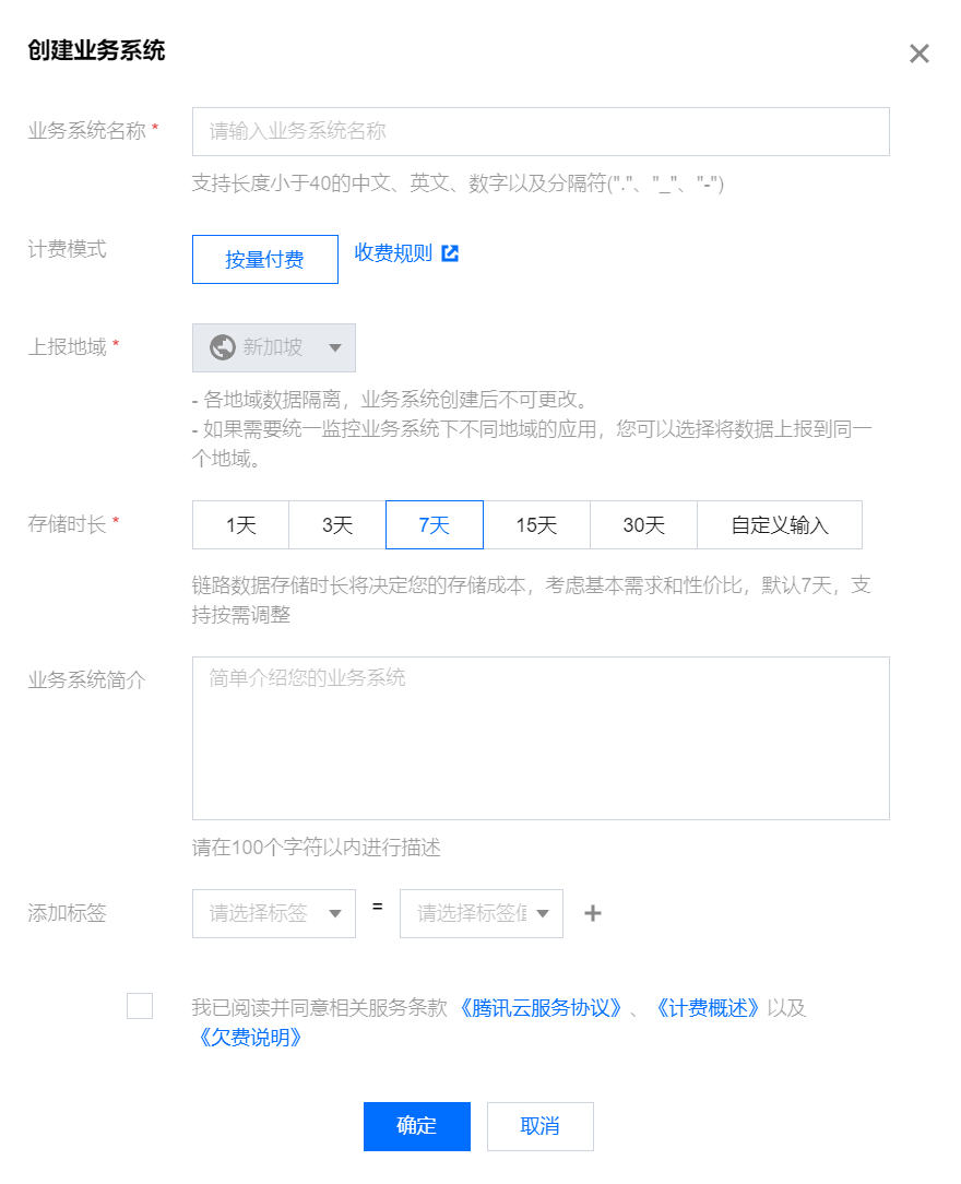 2. 在资源管理页中选择对应的地域,单击新建,按照提示填写业务名称,选择存储时长(存储时长越长,计费越高)。选择完后,勾选相关协议并单击确定