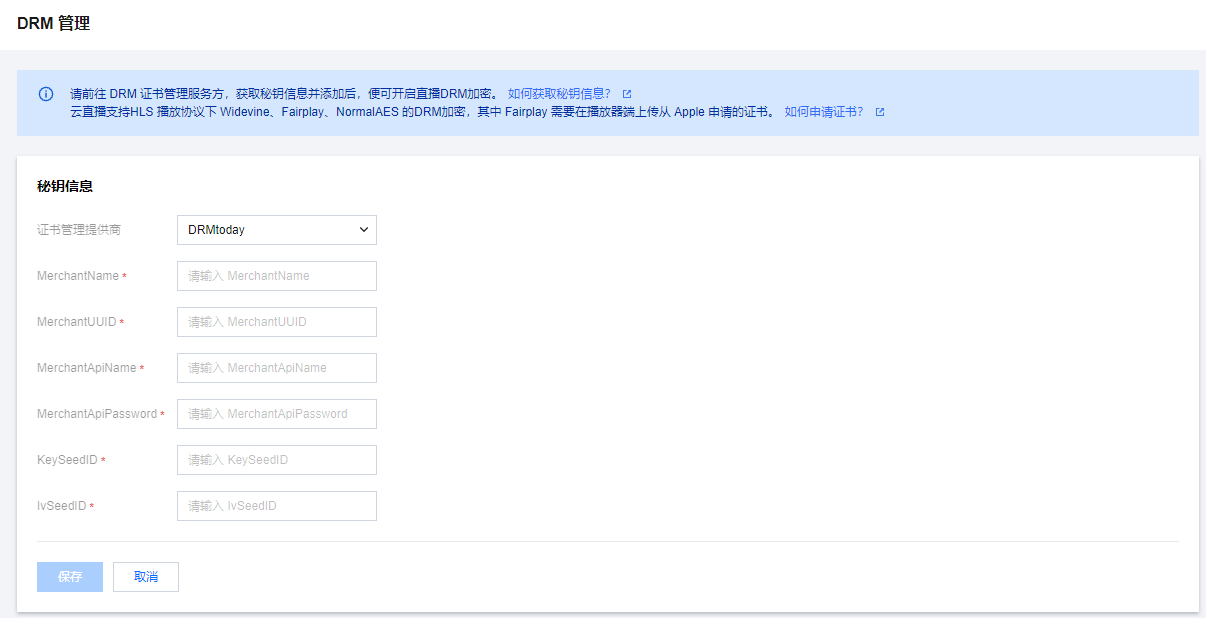 9. 获取用户 merchantName、merchantUUID、merchantAPIname、merchantAPIpassword 及 keySeedID、ivSeedID 后,将用户信息填至云直播 DRM 管理。