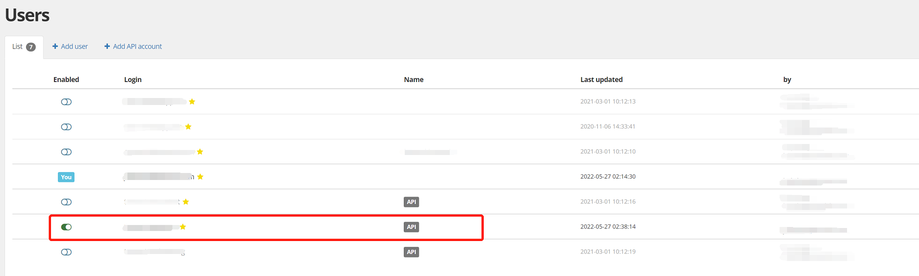 7. 进入 Users 界面,新建API账号,赋予 API 账号及权限,记住密码。