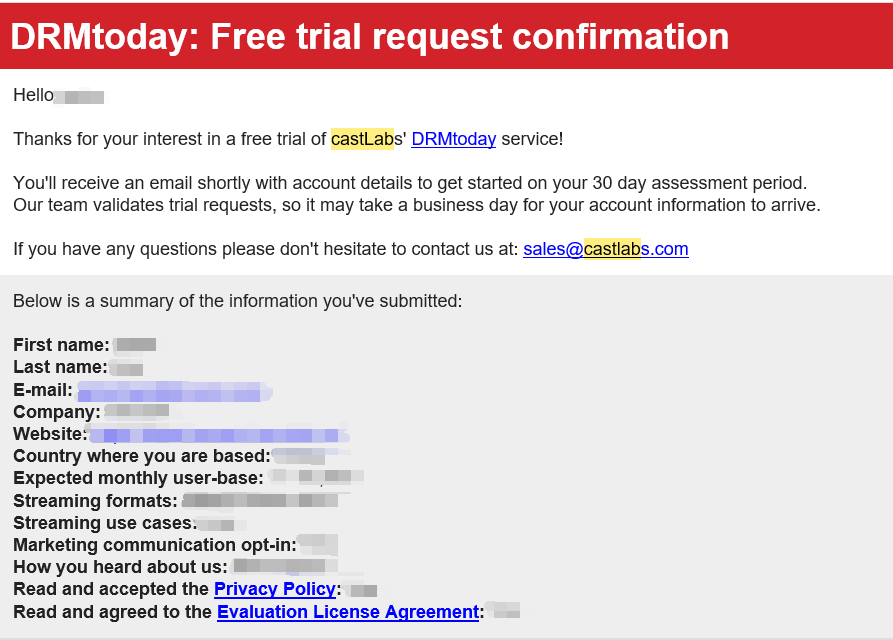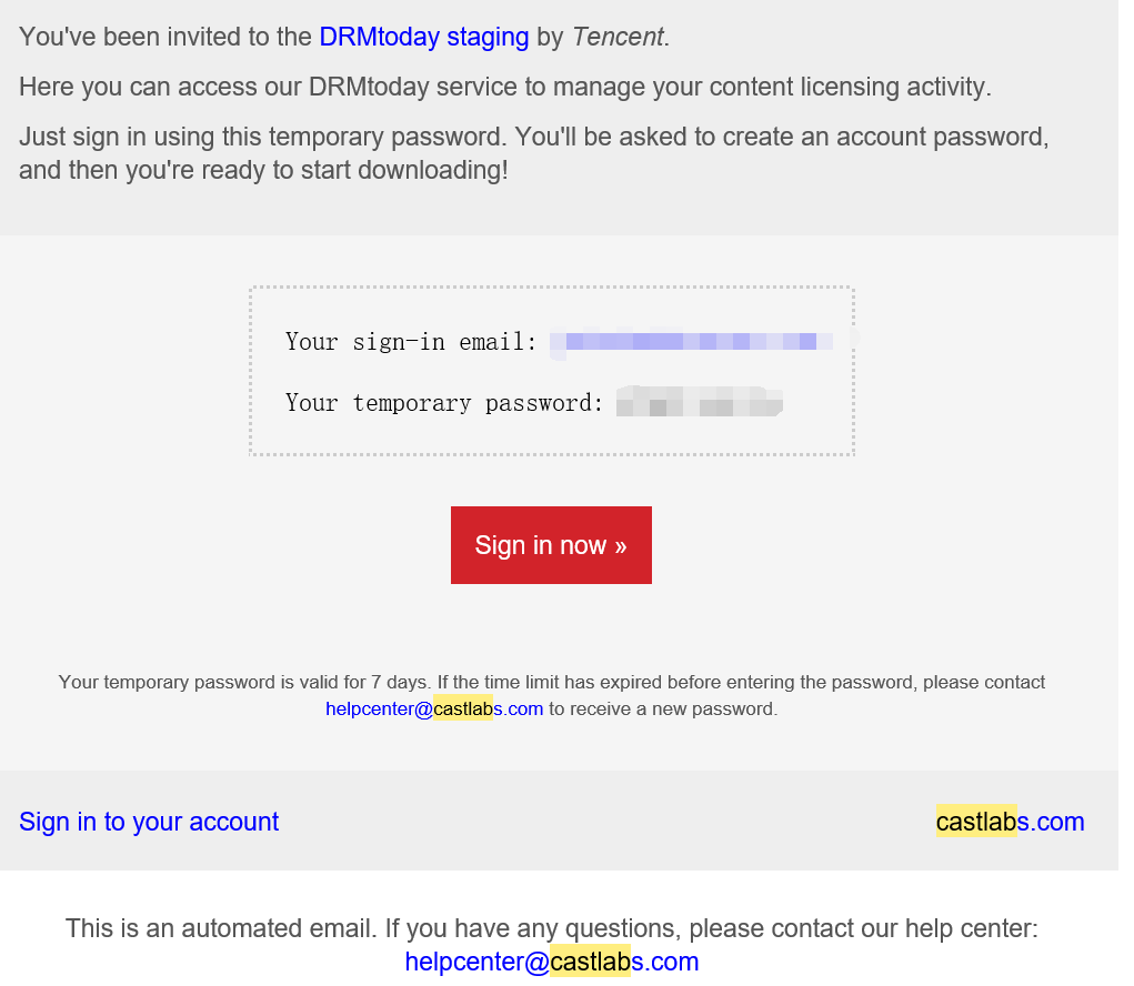 3. DRMtoday 审核通过后会给您发送包含 DRMtoda y登录地址及初始密码的邮件。