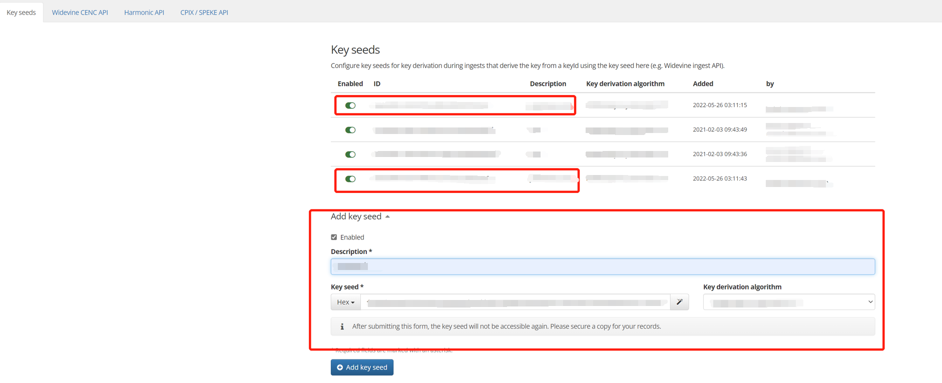 8. 进入 Configuration 中的 Ingest settings 加密密钥获取设置子界面。新建密钥种子,用来生成 key 和 iv。(keySeedID/ivSeedID)