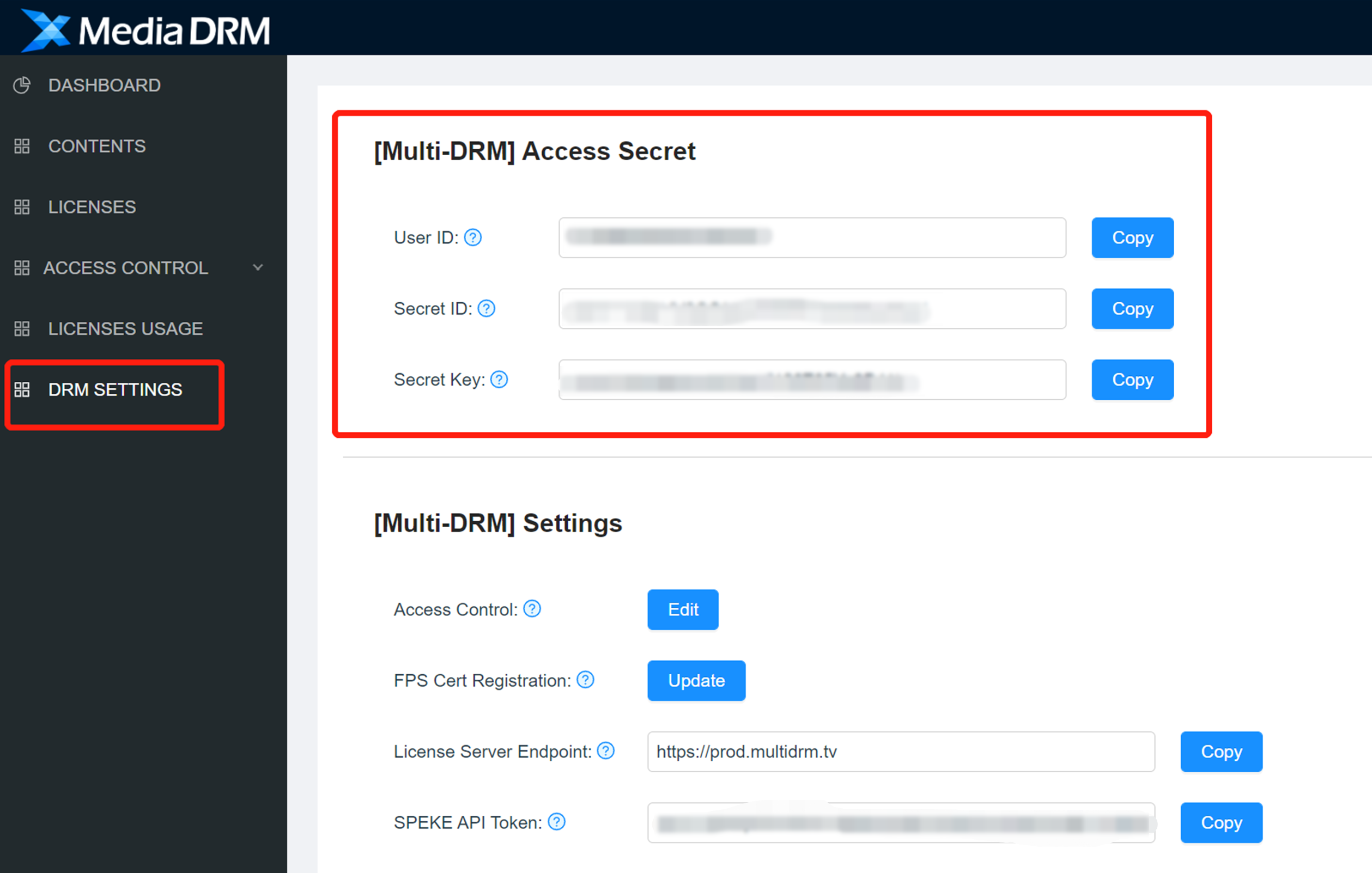 6. 获取 Access Secret 的用户 ID 及密码后,将用户密钥信息填至云直播 DRM 管理。 DRMtoday