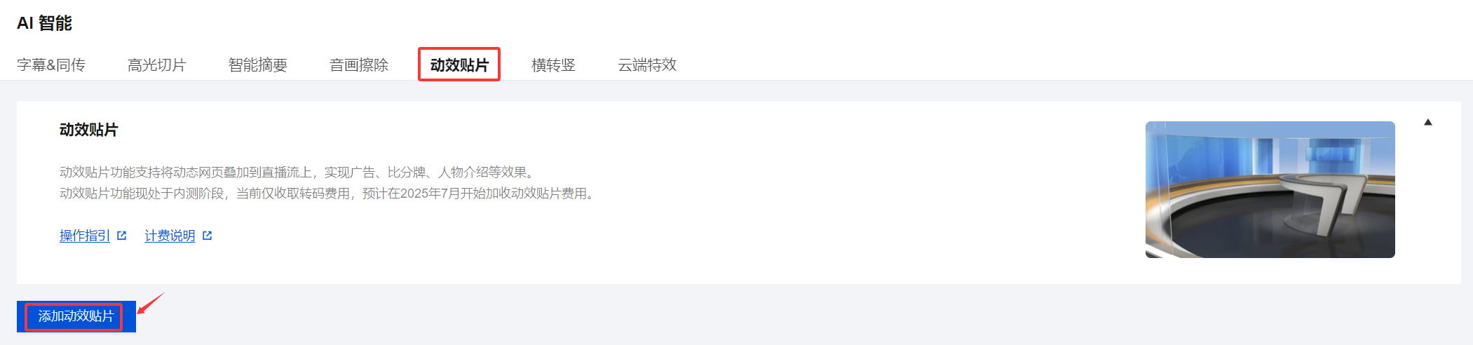 1. 登录 云直播控制台,进入功能配置 > AI 智能 > 动效贴片。 2. 单击添加动效贴片,进入添加窗口。