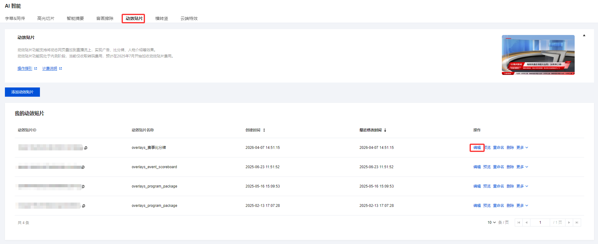 1. 登录 云直播控制台,进入功能配置 > AI 智能 > 动效贴片。 2. 在贴片列表中,根据您的业务需求选择您想要编辑的动效贴片,单击编辑。
