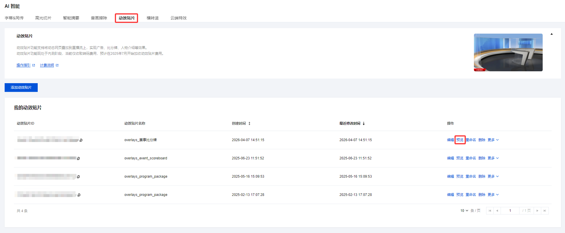1. 登录 云直播控制台,进入功能配置 >AI 智能 > 动效贴片。 2. 在贴片列表中,根据您的业务需求选择想要预览的动效贴片,单击预览,即可打开实时预览窗口。