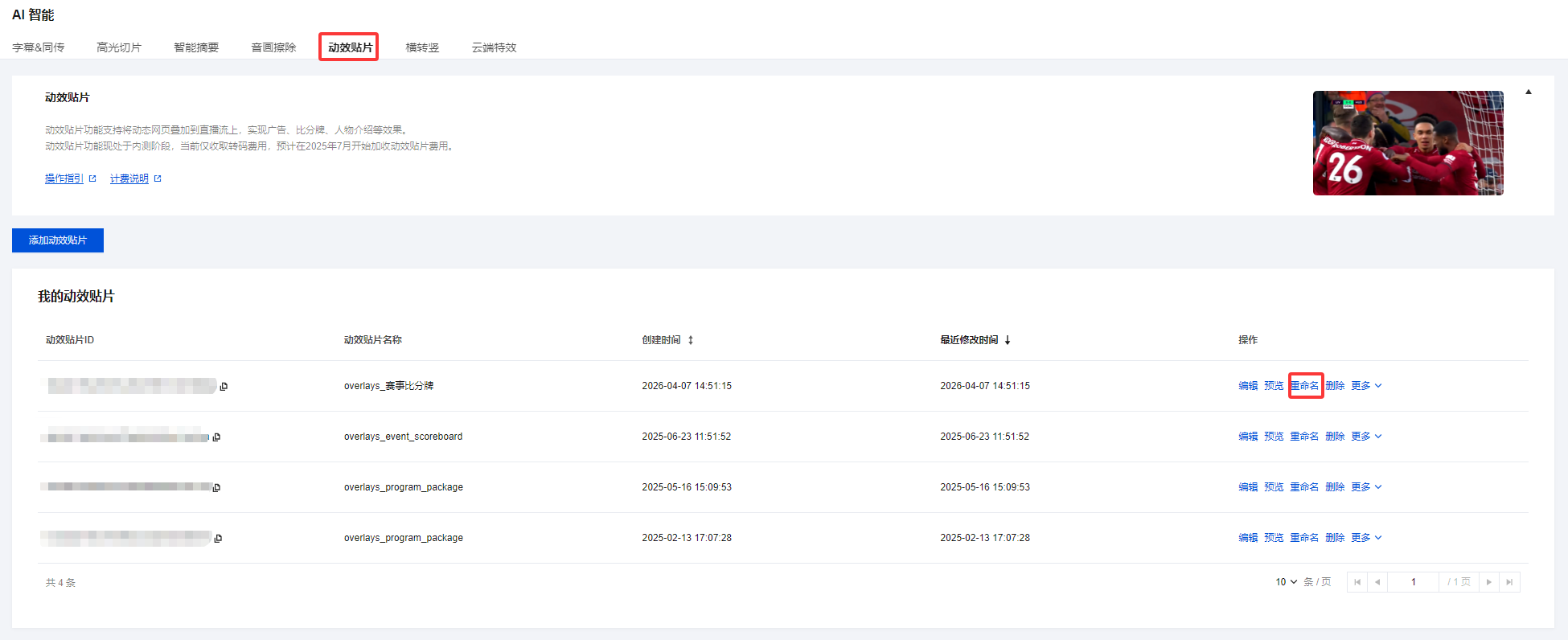 1. 登录 云直播控制台,进入功能配置 > AI 智能 > 动效贴片。 2. 在贴片列表中,根据您的业务需求选择相应的动效贴片,单击重命名。