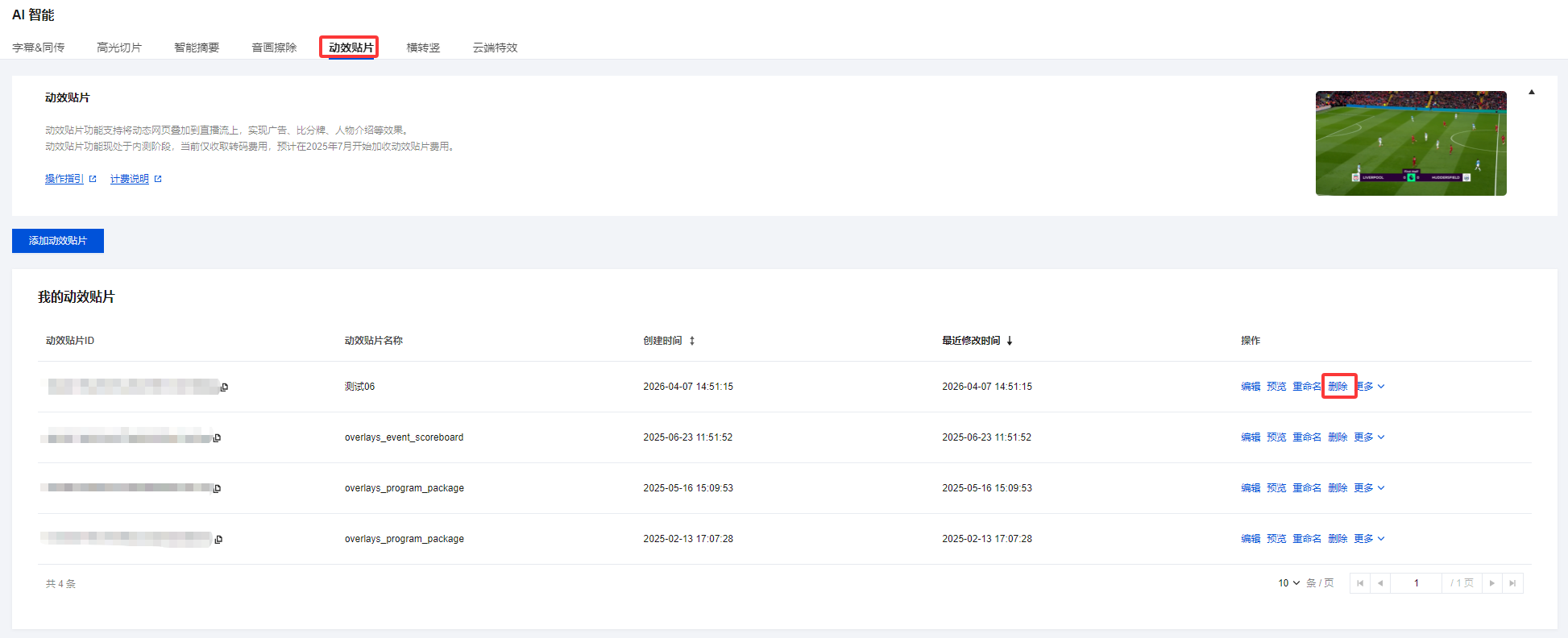 1. 登录 云直播控制台,进入功能配置 > AI 智能 > 动效贴片。 2. 在贴片列表中,根据您的业务需求选择要删除的动效贴片,单击删除。