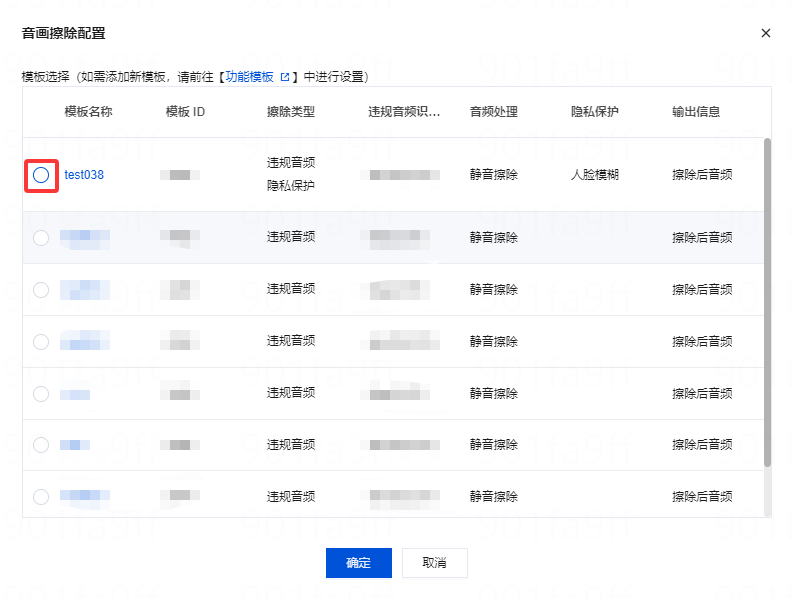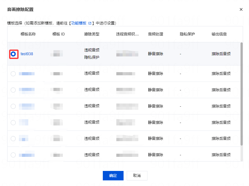 3. 根据您的业务需求选择音画擦除配置模板,然后单击确定即可完成配置。