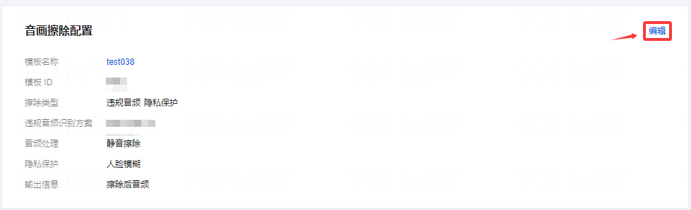 2. 选择模板配置页签。单击音画擦除配置标签右上角的编辑