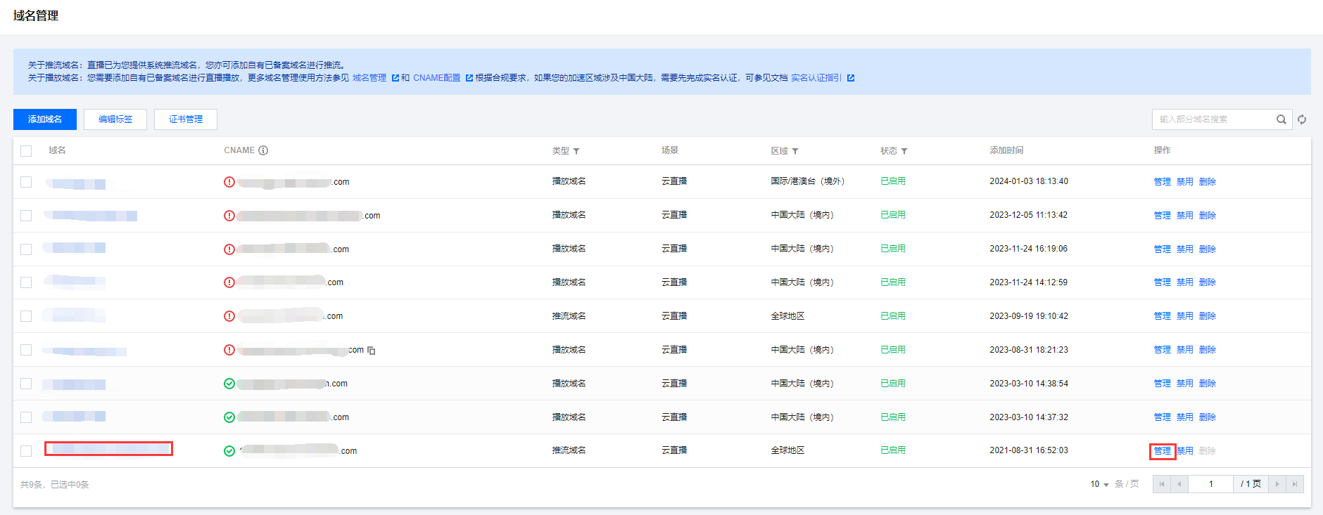 1. 进入 域名管理,单击需配置的推流域名或管理进入域名详情页。 2. 选择模板配置页签,单击高光切片配置标签右上角的编辑。 3. 根据您的业务需求,单击取消相应模板的勾选,单击确定即可。
