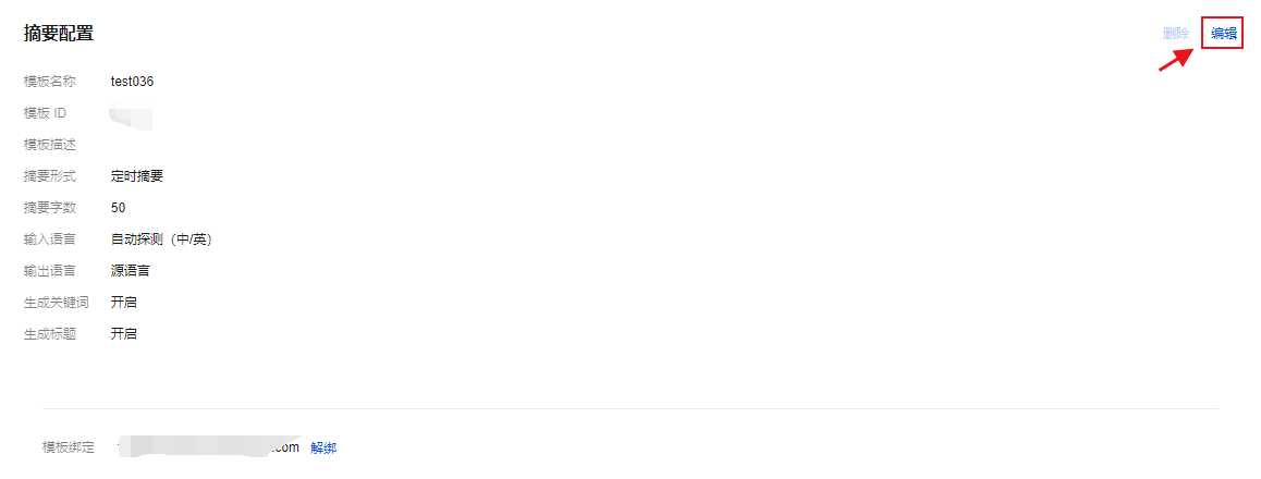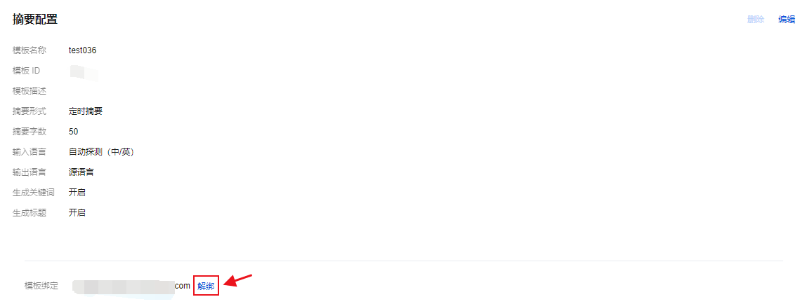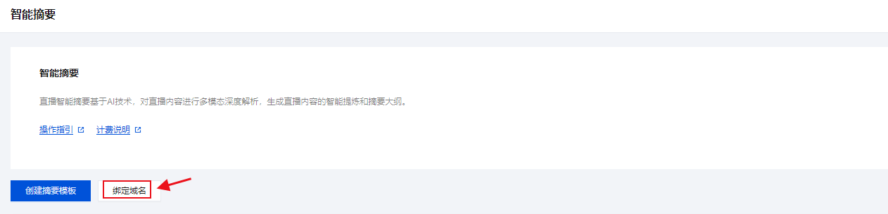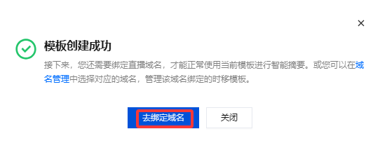 创建智能摘要模板成功后关联域名: 摘要模板创建成功后,单击提醒框中的去绑定域名。