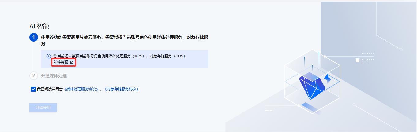4. 授权成功后,勾选服务协议并单击开始使用,系统会自动开通媒体处理产品及对象存储服务(COS),并打开音画擦除管理页面。