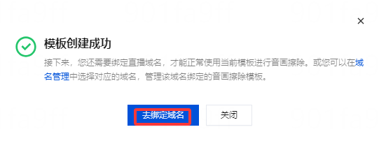 新音画擦除模板创建成功后关联域名:音画擦除模板创建成功后,单击提醒框中的去绑定域名。