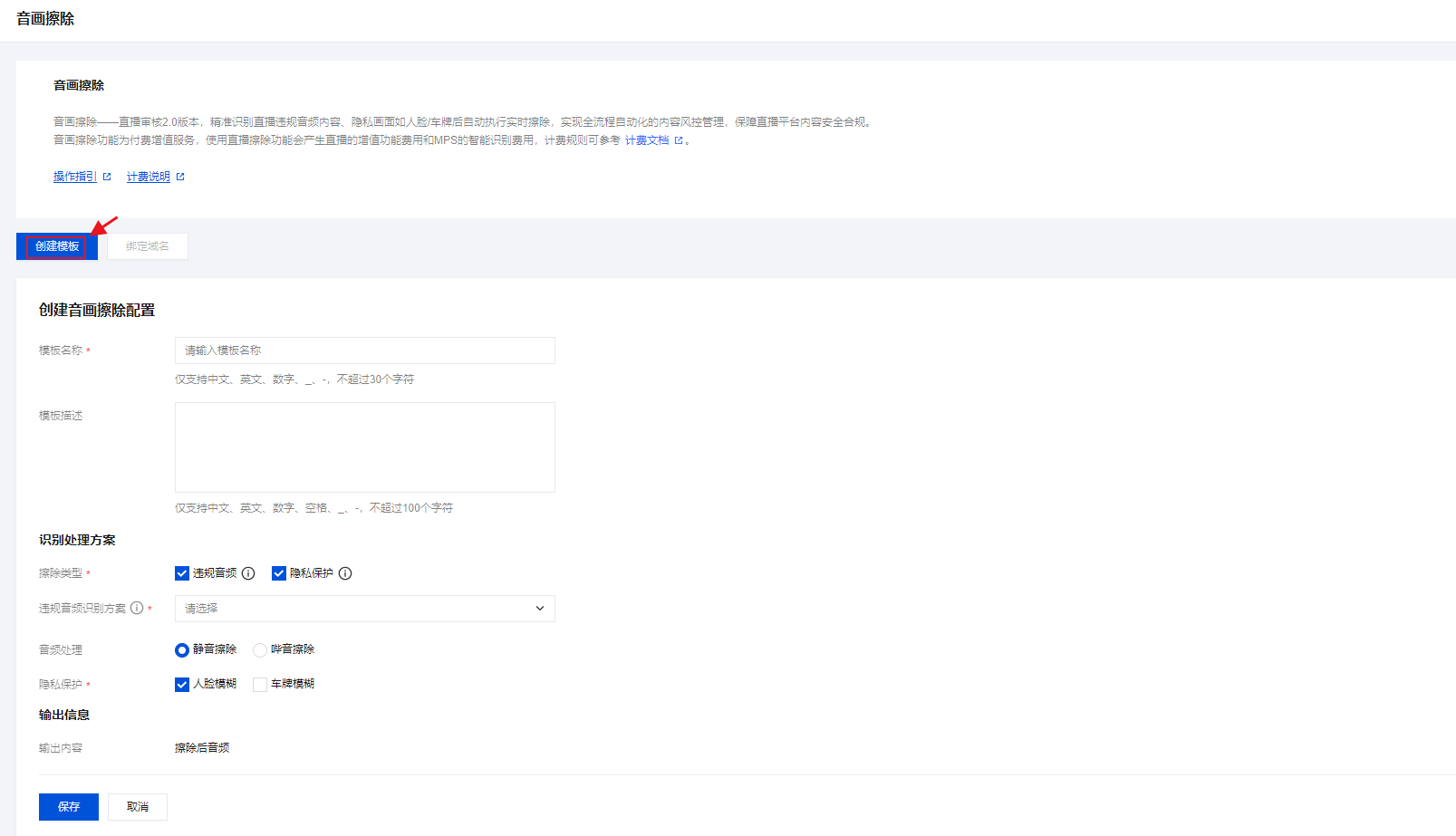 5. 单击创建模板,进入音画擦除模板创建页,进行如下配置: