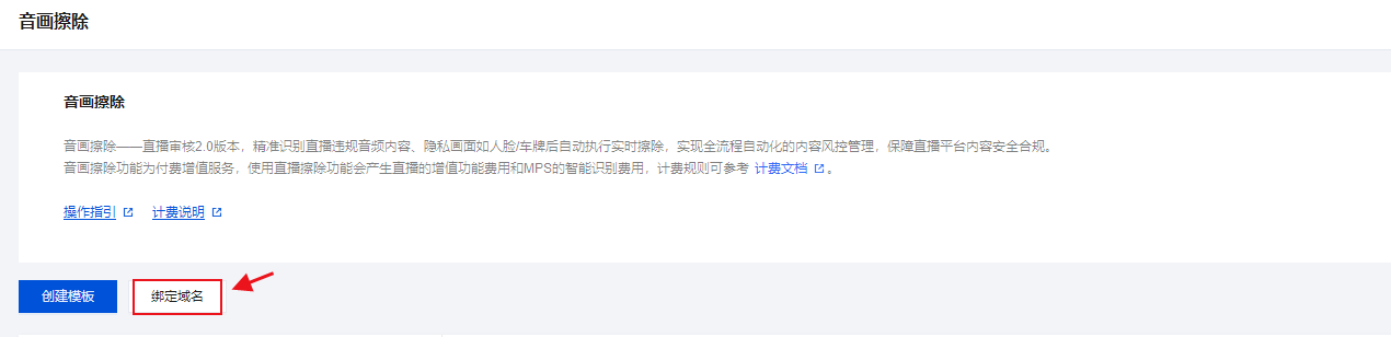 1. 登录 云直播控制台, 在左侧导航栏中,选择 AI 智能 > 音画擦除。 2. 通过以下方式进入域名绑定窗口: