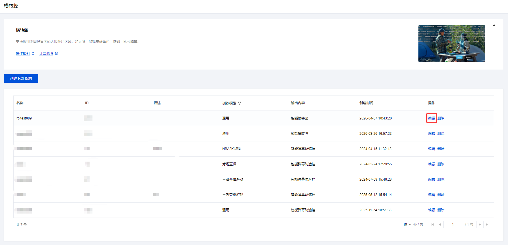 2. 选择您已创建成功的 ROI 配置模板,并单击右侧的编辑,即可进入修改模板信息。