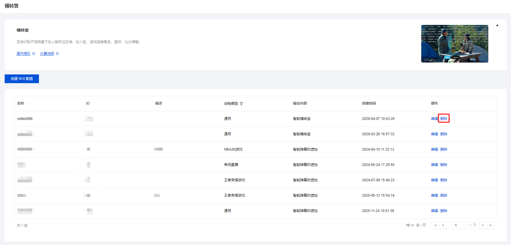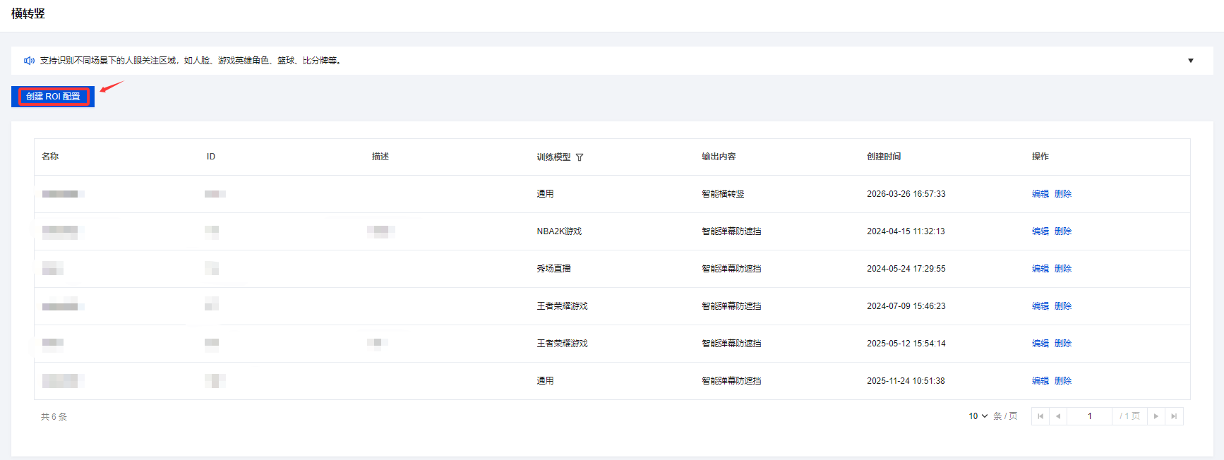 5. 进入横转竖管理页面,单击创建 ROI 配置。