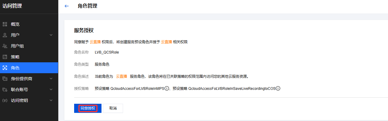 3. 在角色管理页面,单击同意授权,完成身份校验后即可完成媒体处理和对象存储服务(COS)授权,正常使用媒体处理服务。