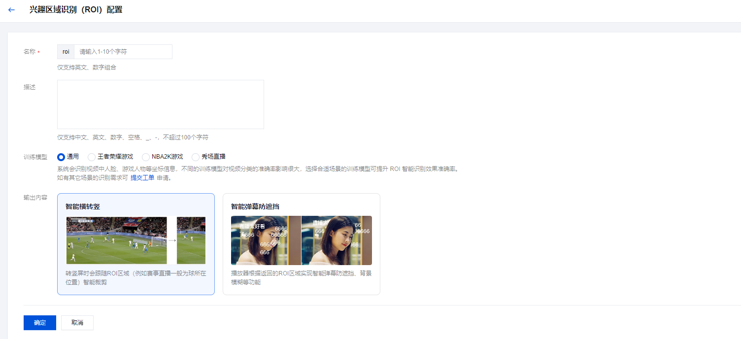 输出内容 | 默认设置为智能横转竖,可选择智能弹幕防遮挡功能。 智能横转竖:转竖屏时会跟随 ROI 区域(例如赛事直播一般为球所在位置)智能裁剪。 智能弹幕防遮挡:播放器根据返回的 ROI 区域实现智能弹幕防遮挡、背景模糊等功能。 |