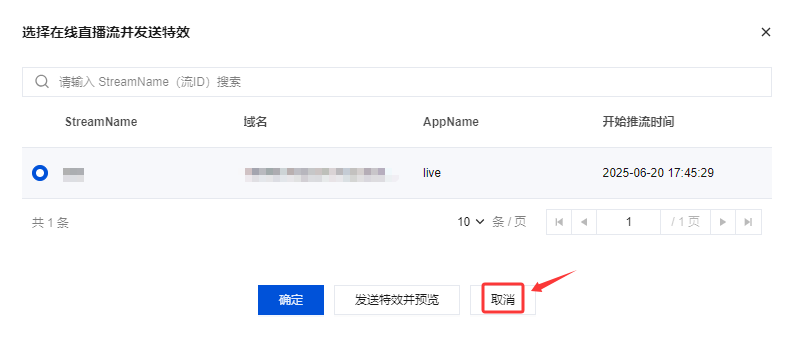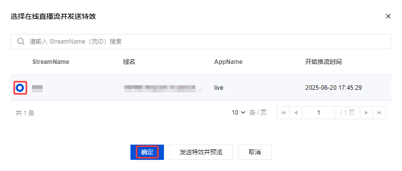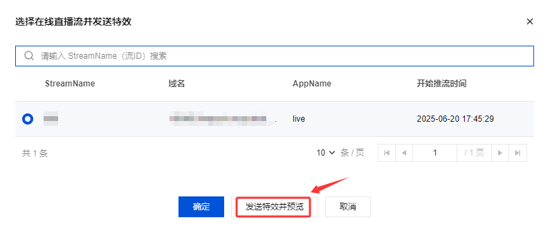 1. 登录 云直播控制台,进入 AI 智能 > AI 云端特效,单击发送特效。 2. 在弹窗页面中,勾选在线直播流,单击确定即可发送特效。