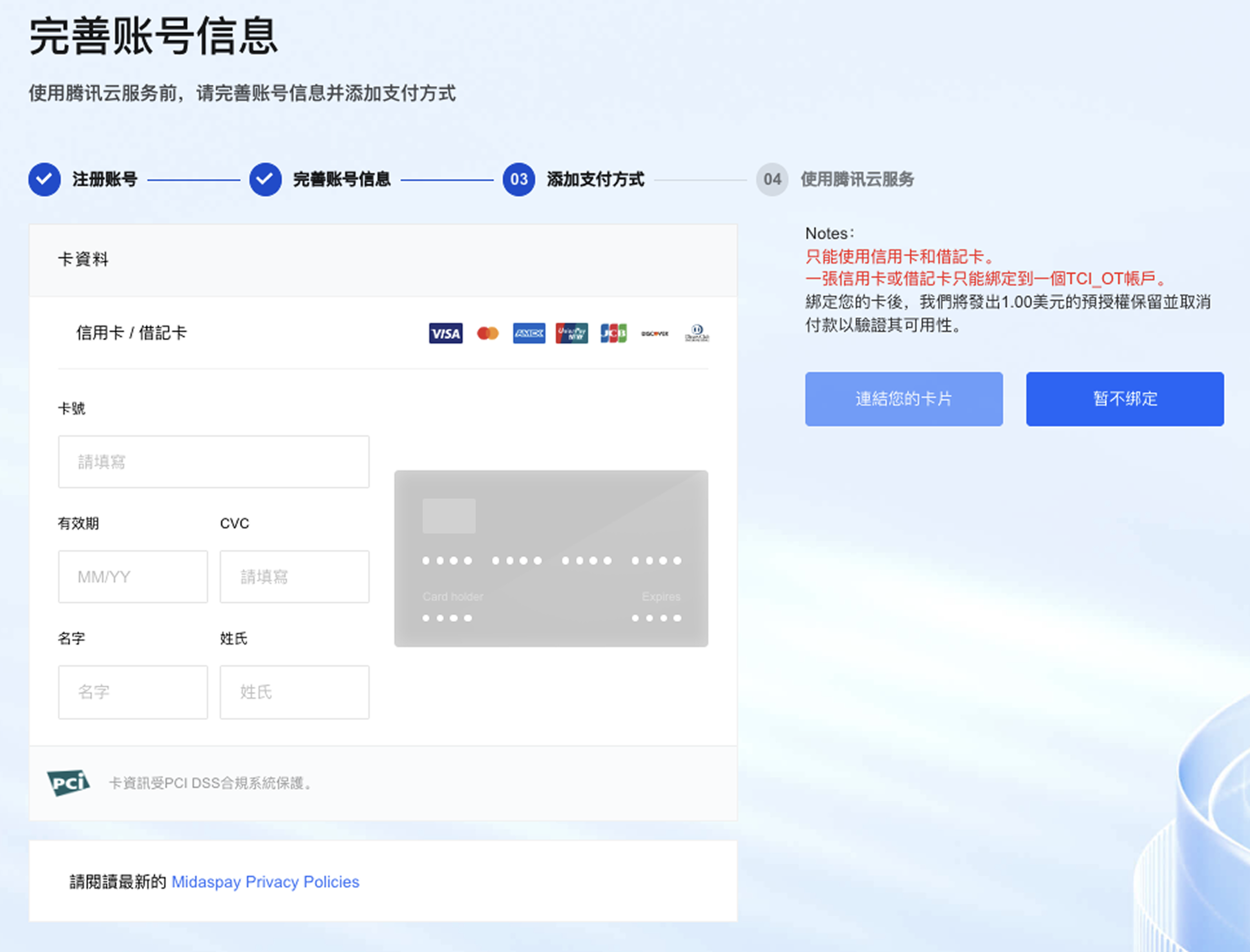 腾讯云不支持预付卡、虚拟卡、礼品卡,且不支持绑定企业账户。部分卡品牌可能不支持借记卡,若无法绑定建议您更换为其他新卡。