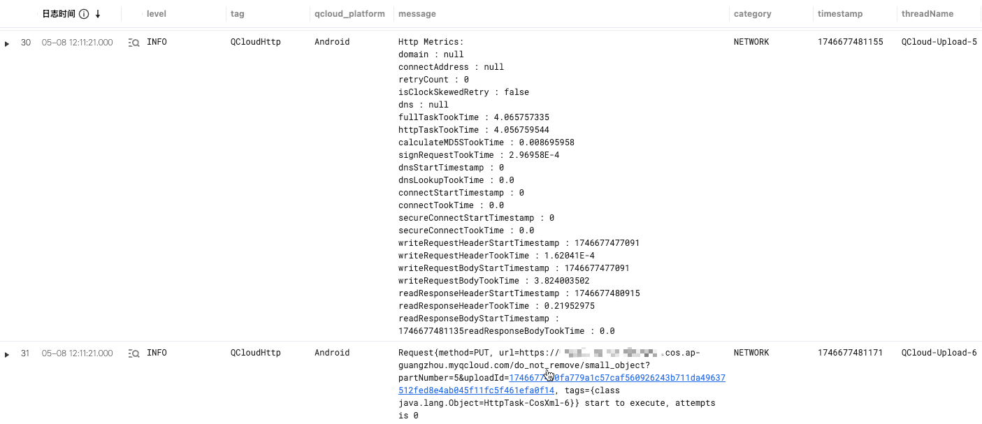 // 通过 CosXmlServiceConfig 中 setDebuggable 方法可以配置控制台和文件日志的开启和关闭,设置为 true 时会开启// 是否开启控制台日志COSLogger.enableLogcat(true);// 是否开启文件日志COSLogger.enableLogFile(true);// 定义日志监听器CosLogListener listener = new CosLogListener() {@Overridepublic void onLog(LogEntity entity) {Log.d("CosLogListener", entity.getLogcatString());}};// 添加日志监听器COSLogger.addLogListener(listener);// 删除日志监听器COSLogger.removeLogListener(listener);// 设置全局最小日志等级(渠道设置优先于全局设置)COSLogger.setMinLevel(LogLevel.VERBOSE);// 设置控制台最小日志等级COSLogger.setLogcatMinLevel(LogLevel.VERBOSE);// 设置文件最小日志等级COSLogger.setFileMinLevel(LogLevel.VERBOSE);// 设置cls最小日志等级(必须进行 setCLsChannel 后配置,否则不生效)COSLogger.setClsMinLevel(LogLevel.VERBOSE);// 设置设备IDCOSLogger.setDeviceID("DeviceID");// 设置设备型号COSLogger.setDeviceModel("DeviceModel");// 设置APP版本号COSLogger.setAppVersion("AppVersion");// 设置拓展字段Map<String, String> extras = new HashMap<>();extras.put("userID", "userID");COSLogger.setExtras(extras);// 获取日志文件文件列表,参数为最近多少个,例如最近10个日志文件File[] files = COSLogger.getLogFiles(10);// 获取日志文件目录路径String logRootDir = COSLogger.getLogRootDir();// 添加自定义脱敏规则COSLogger.addSensitiveRule("(q-ak=)[^&\\\\\\\\s]+", "$1***");// 移除脱敏规则COSLogger.removeSensitiveRule("(q-ak=)[^&\\\\\\\\s]+");