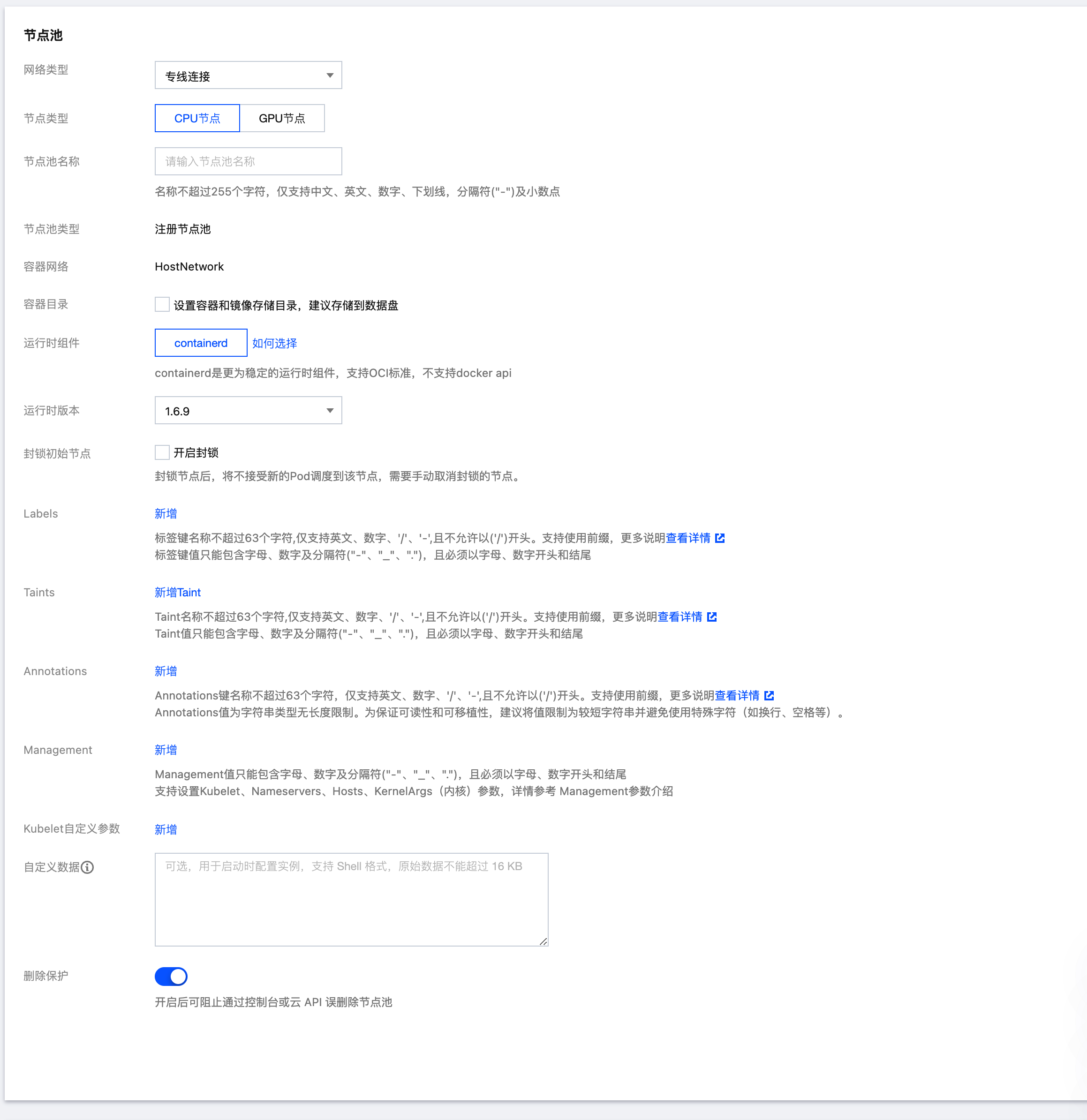 5. 进入新建节点池页面,参考以下提示进行设置。