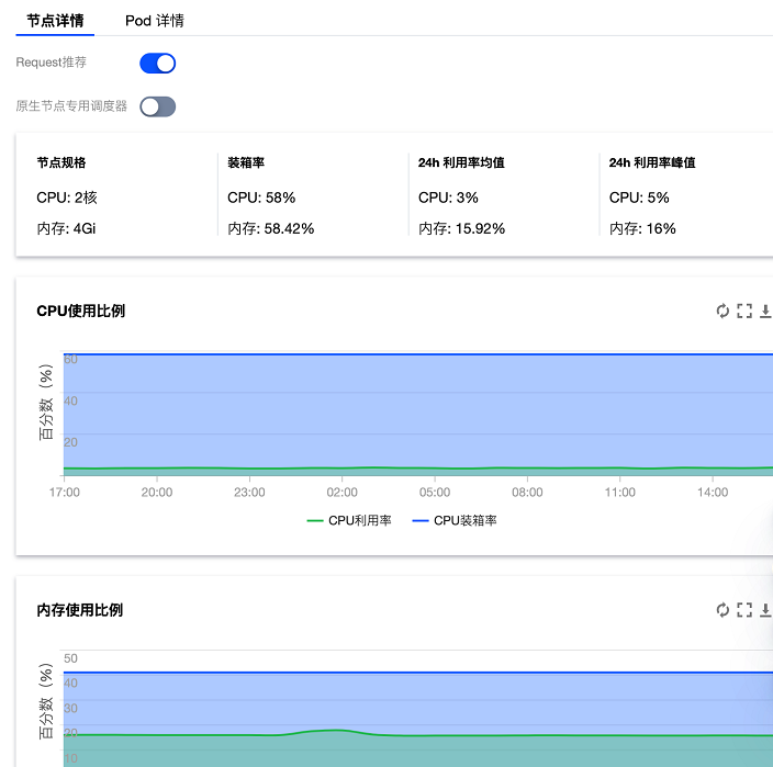 Request 推荐:集群级别的功能开关。开启后,可以根据 Workload 的使用情况,给 Workload 推荐合适的 Request。详情请参见 Request 推荐。 原生节点专用调度器:集群级别的功能开关。开启后,可以虚拟放大原生节点规格,调度更多的 Pod。详情请参见 原生节点专用调度器。 节点信息