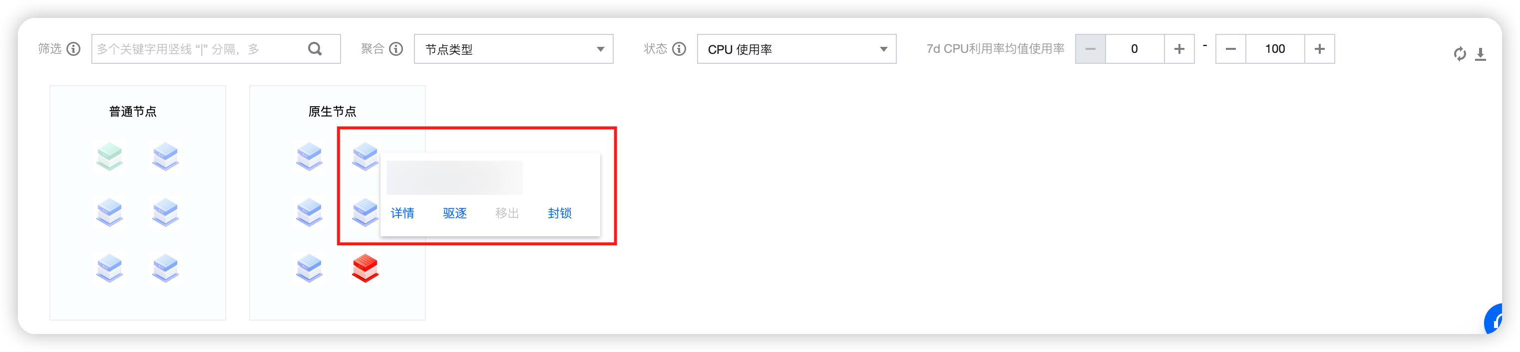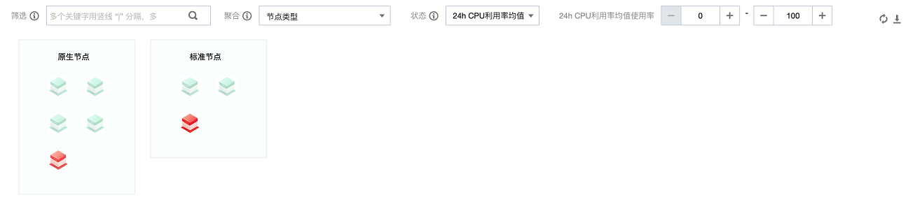 状态:您可以通过节点状态进行筛选,支持选择 CPU 使用率、内存使用率、 CPU 装箱率和内存装箱率。
