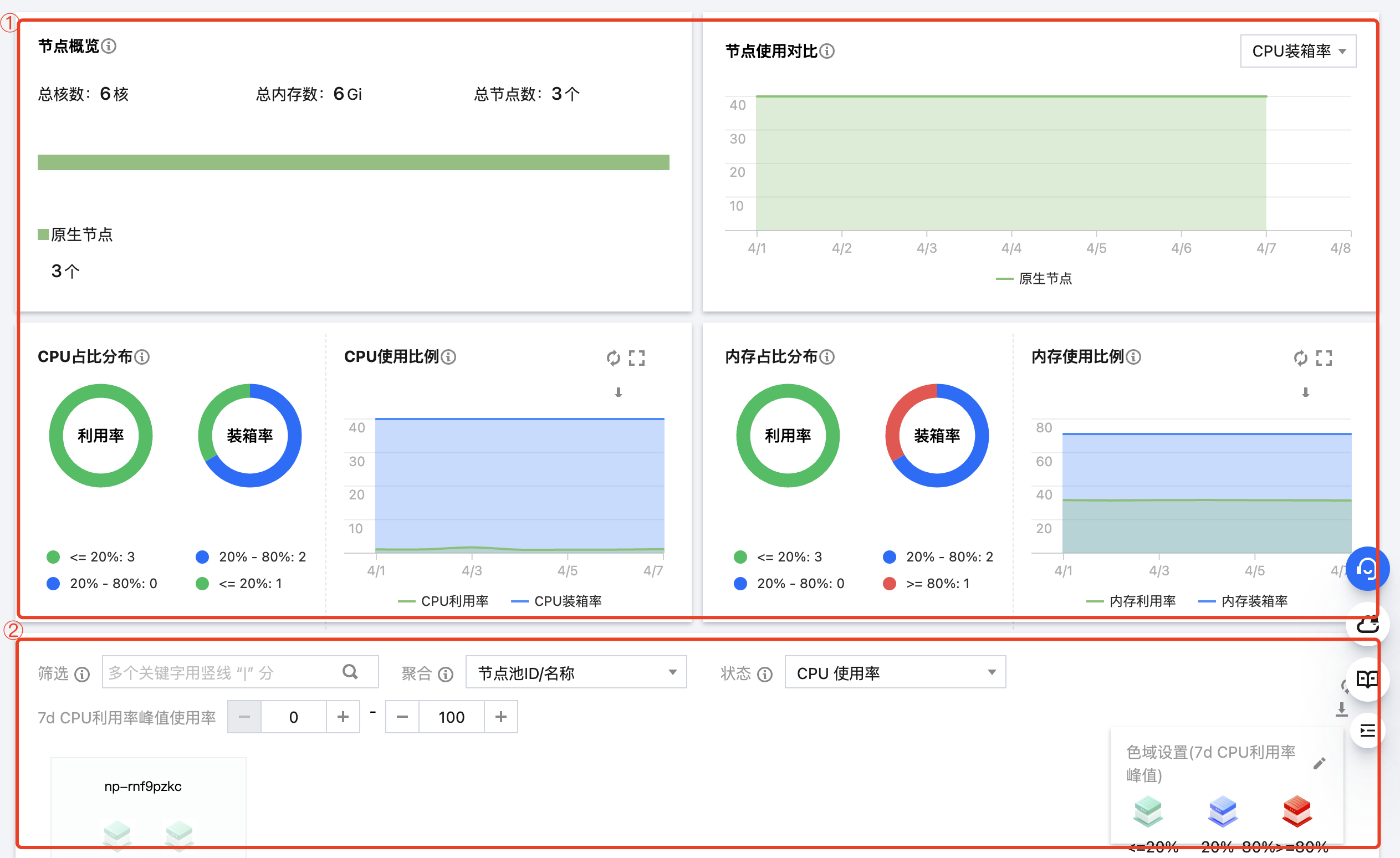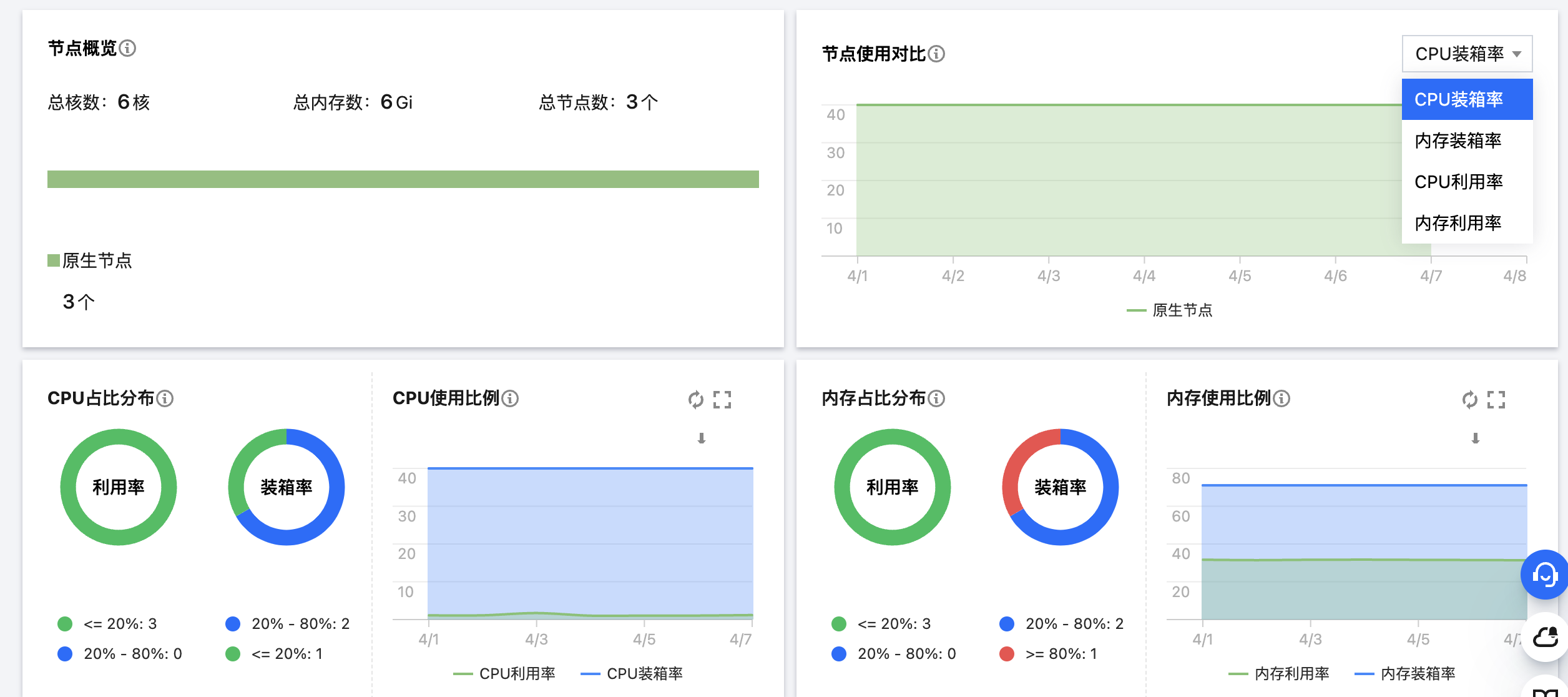 展示了集群中节点(原生节点、普通节点、注册节点)CPU /内存使用情况的分布。