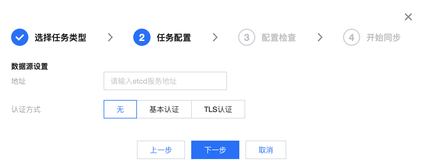 6. 单击下一步,进行配置检查。任务配置完成后,后台会根据源 etcd 访问地址和认证信息进行连接测试。测试内容包含:网络是否可达、权限是否正确、版本是否支持以及数据大小是否满足预期。