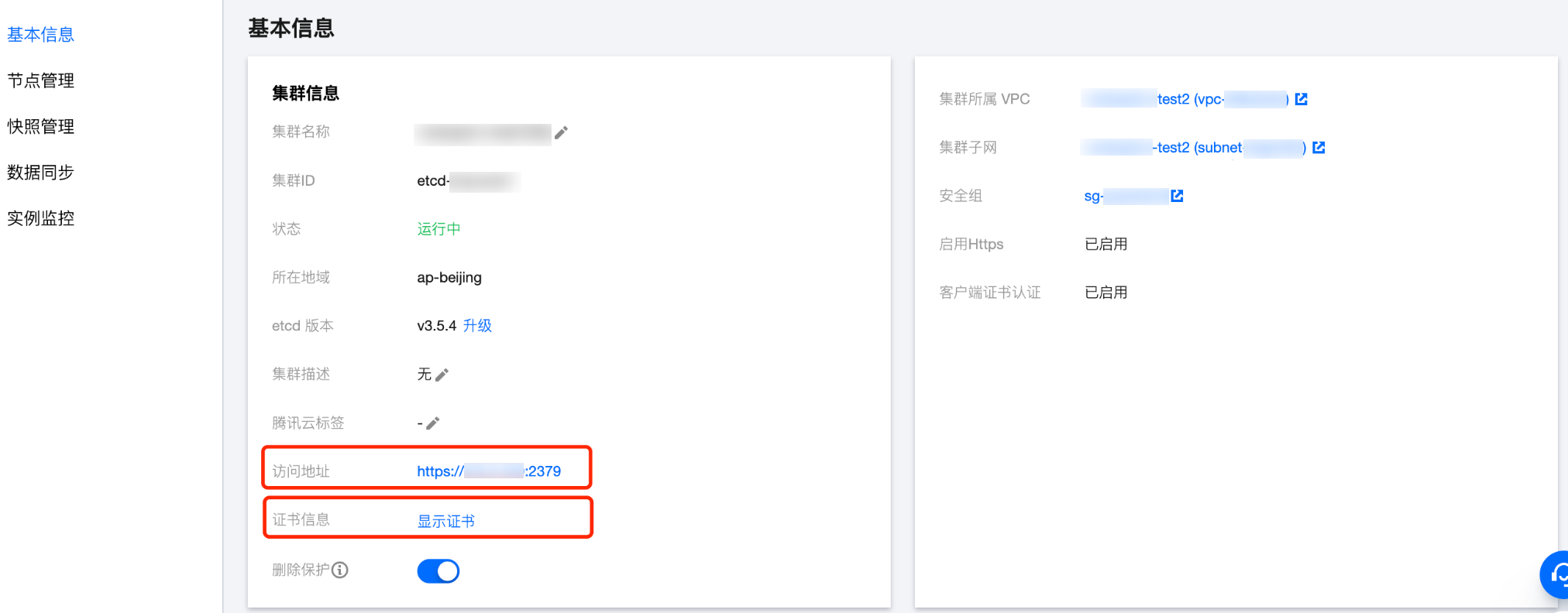 5.2 根据源 etcd 集群的认证方式,完成密钥或证书信息的填写。以现有云原生 etcd 集群为例,您可从基本信息页面获取集群的证书信息,并填写至 TLS 认证模块。如下图所示: