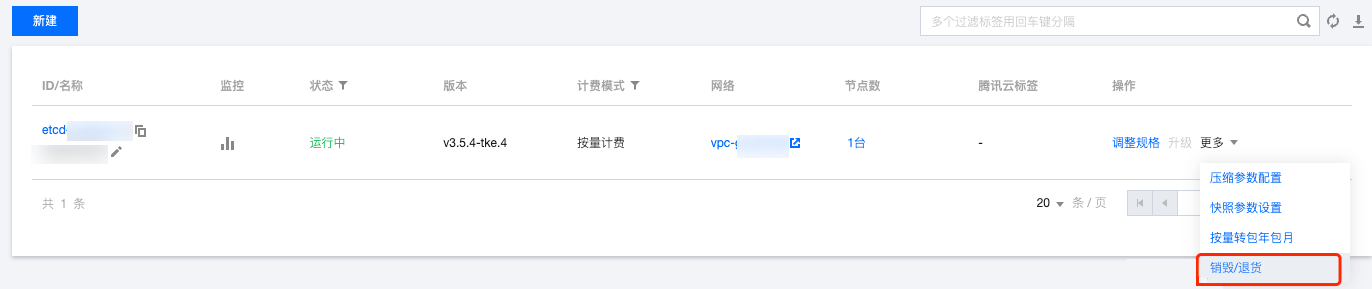 2. 在云原生 etcd 页面,选择集群右侧的更多 > 销毁/退货。如下图所示:
