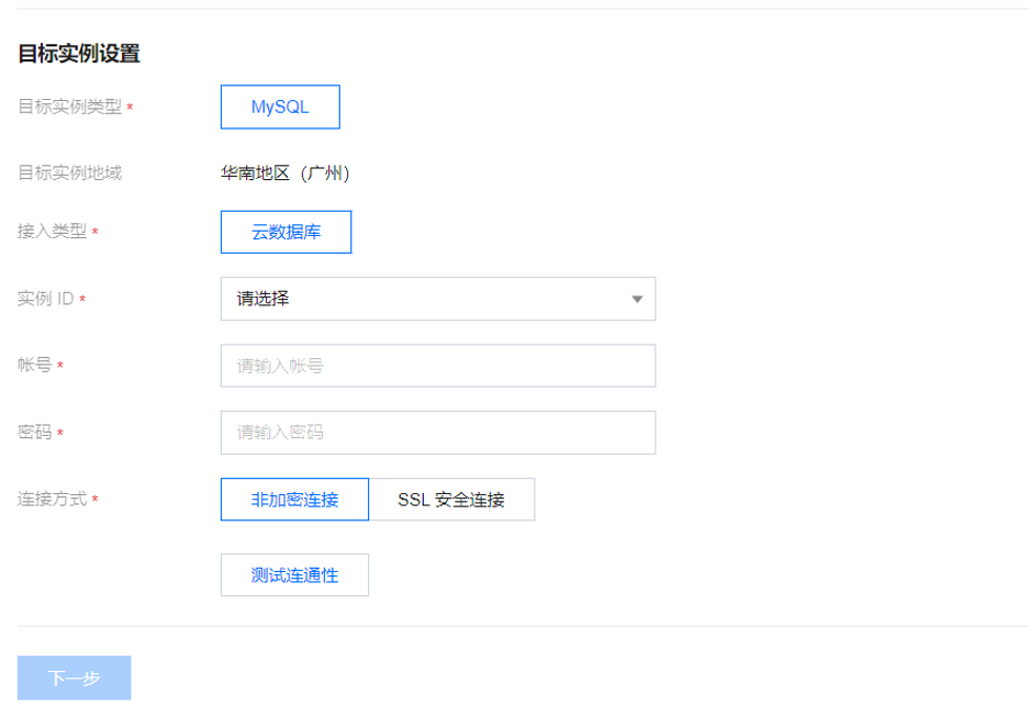 2. 在配置同步任务页面,配置源端实例、账号密码,配置目标端实例、账号和密码,测试连通性后,单击下一步