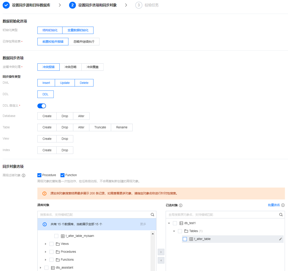 选择高级对象进行同步时,建议不要进行库表重命名操作,否则可能会导致高级对象同步失败。
