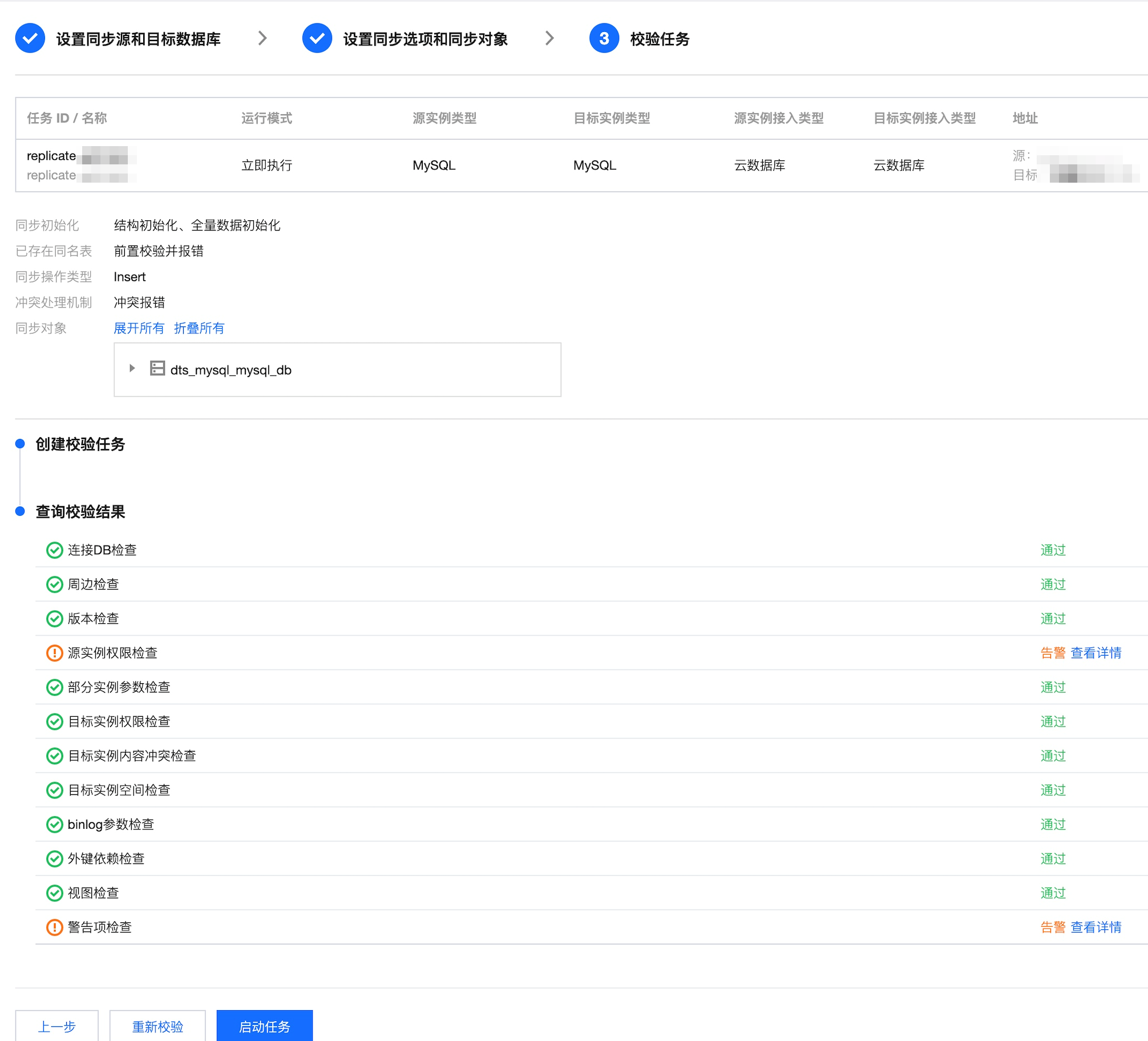 4. 在校验任务页面,完成校验并全部校验项通过后,单击启动任务。 如果校验任务不通过,可以参考 校验不通过处理方法 修复问题后重新发起校验任务。