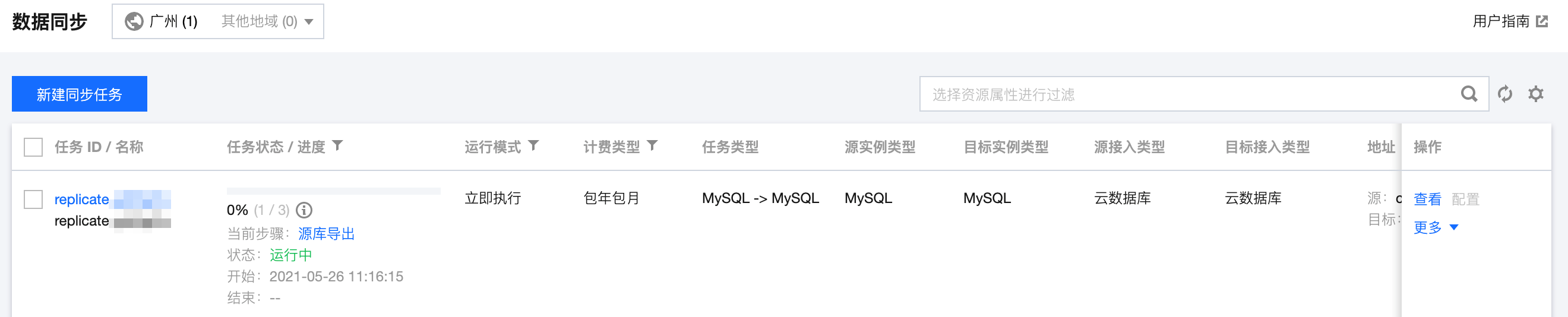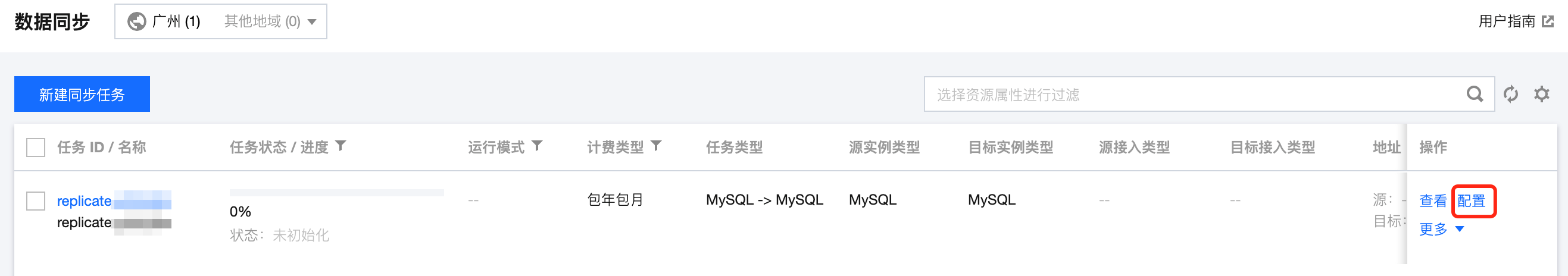 1. 购买完成后,返回 数据同步列表,可看到刚创建的数据同步任务,单击操作列的配置,进入配置同步任务页面。