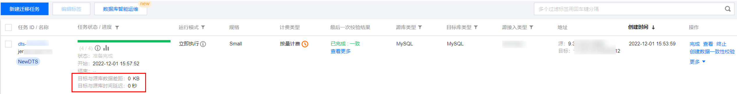 待正向同步任务中,数据差距和时延差距都为0,即可启动割接。