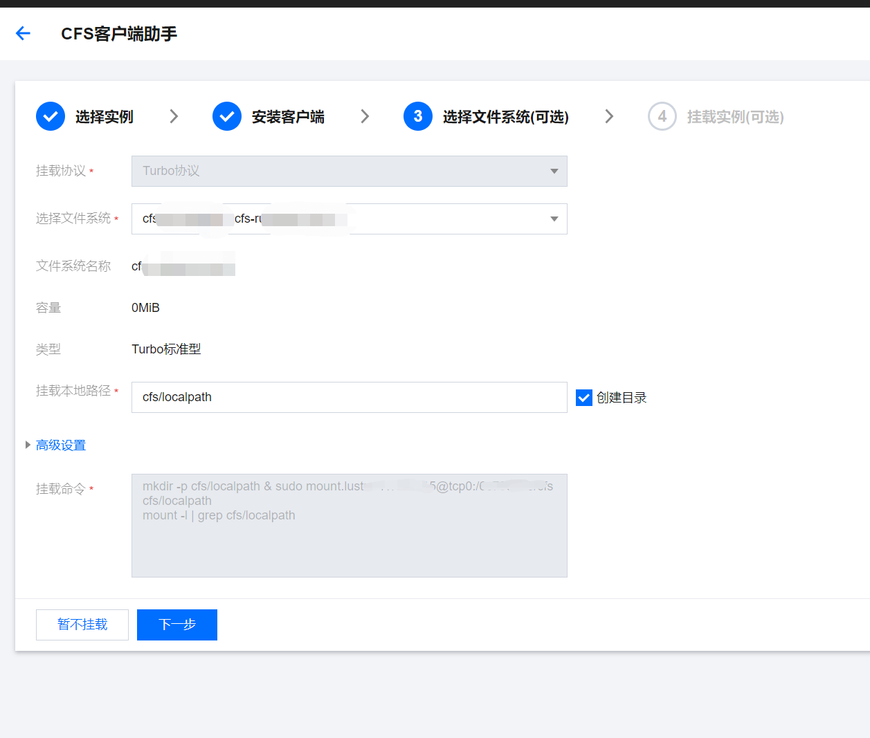 5. 如需挂载文件系统,单击下一步,选择需要挂载的文件系统。您可以自定义挂载本地路径,并通过勾选创建目录,来增加创建目录的命令行。您如果有其他需求,可以通过高级设置配置 CFS 文件系统目录和其他挂载选项。配置完成后单击下一步。