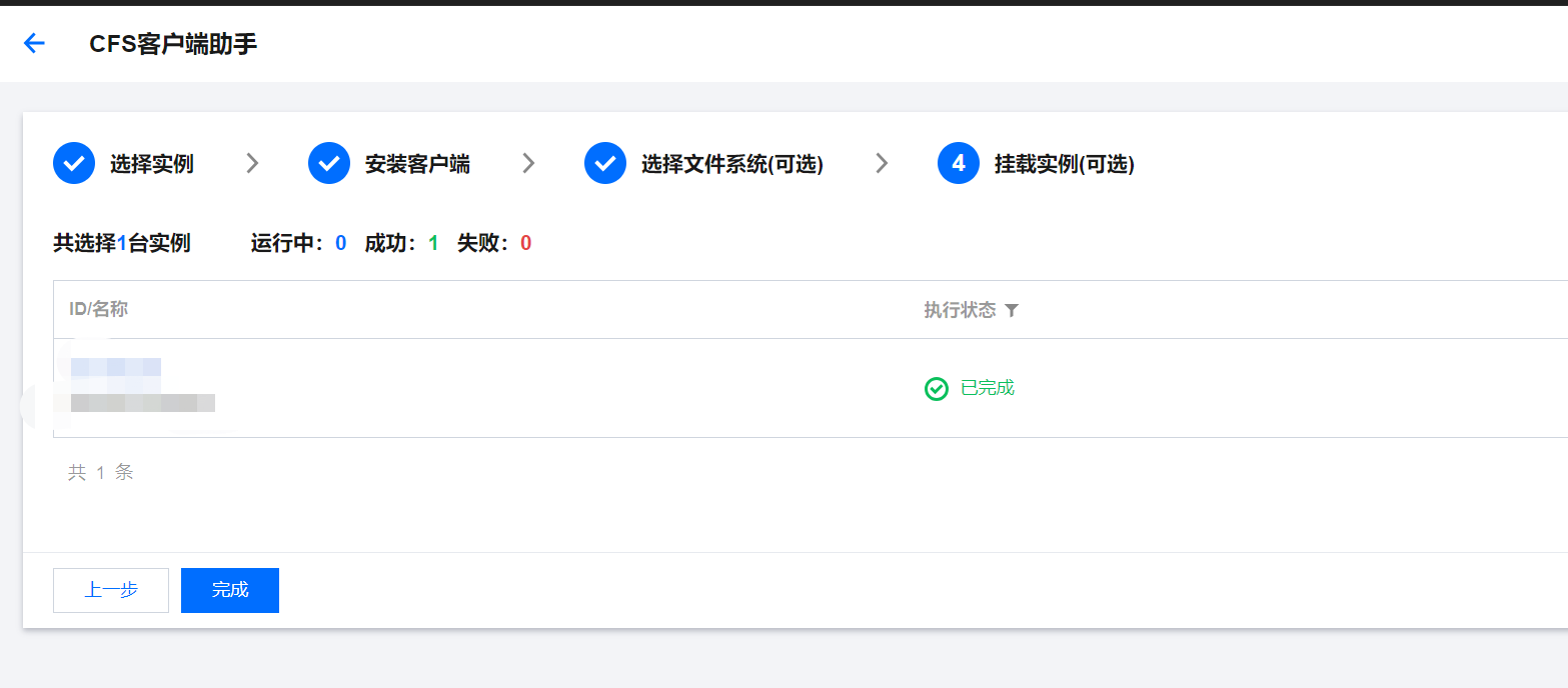 4. 进入安装客户端步骤,未安装客户端的实例会自动安装。成功安装后,执行状态显示已完成。如安装失败,请检查实例类型是否与所选客户端类型存在冲突,如安装 Turbo 客户端需要操作系统及内核版本满足兼容性要求。如您暂不需要挂载文件系统,点击完成安装回到文件系统列表页。