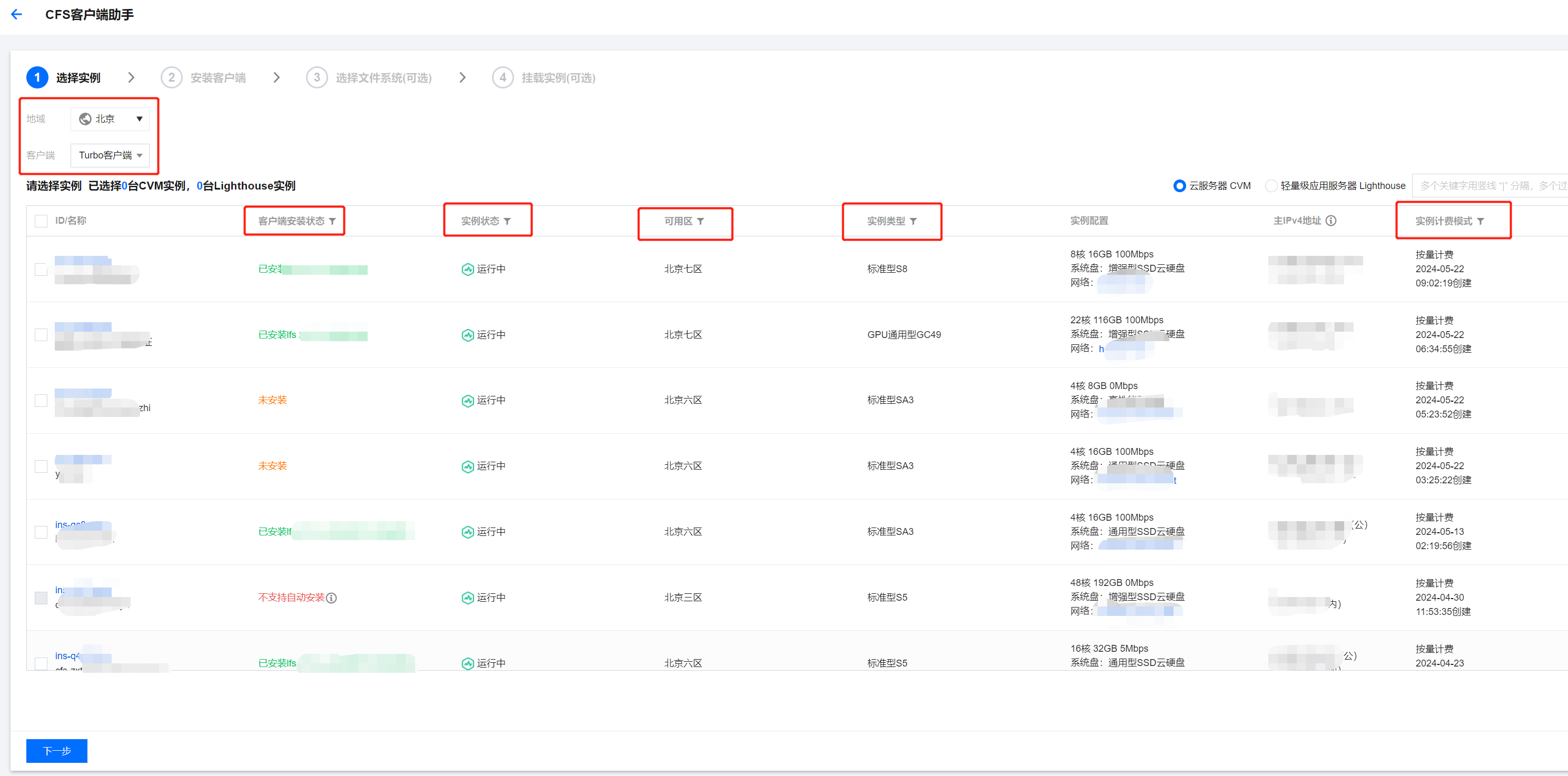 3. 您可以按照地域、客户端类型、客户端安装状态等字段筛选,批量勾选实例。确认无误后,单击下一步。其中,客户端安装状态说明如下所示: