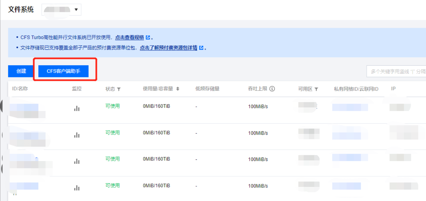 2. 在文件存储列表上方单击 CFS 客户端助手。
