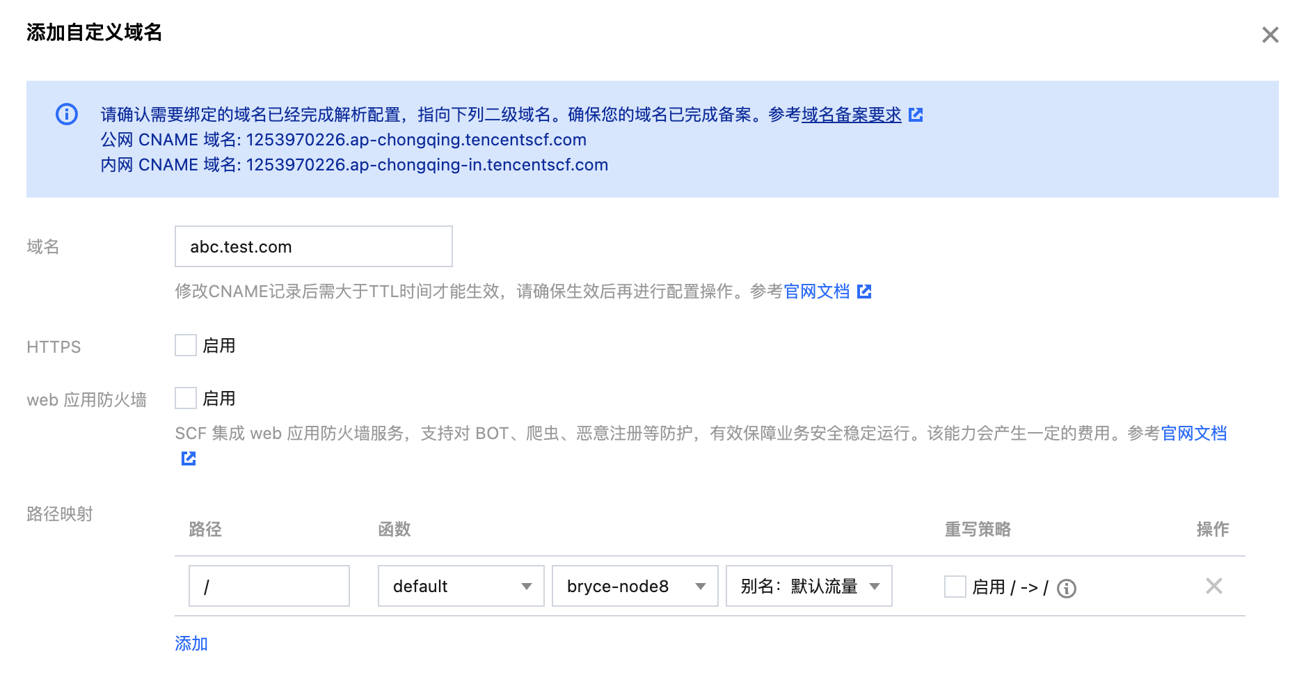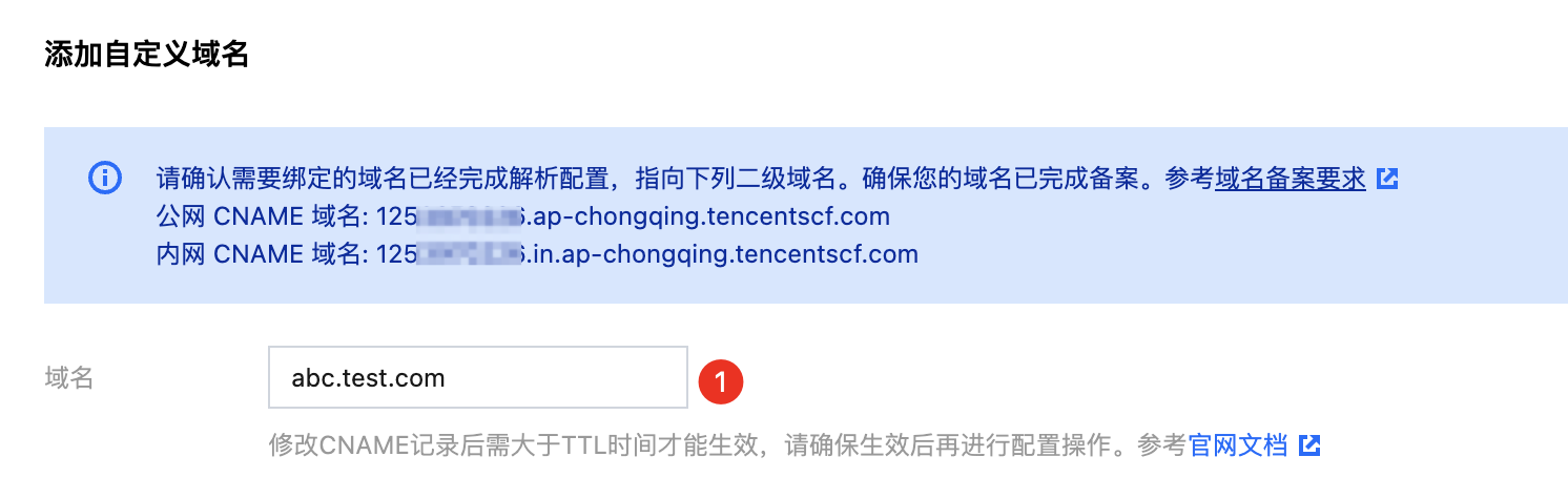公网 CNAME:<appid>.<region>.tencentscf.com 示例:123456.ap-guangzhou.tencentscf.com