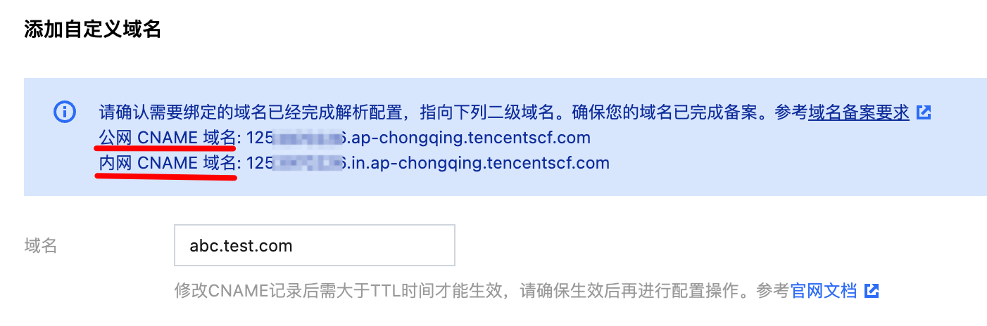 内网 CNAME:<appid>.in.<region>.tencentscf.com 示例:123456.in.ap-guangzhou.tencentscf.com