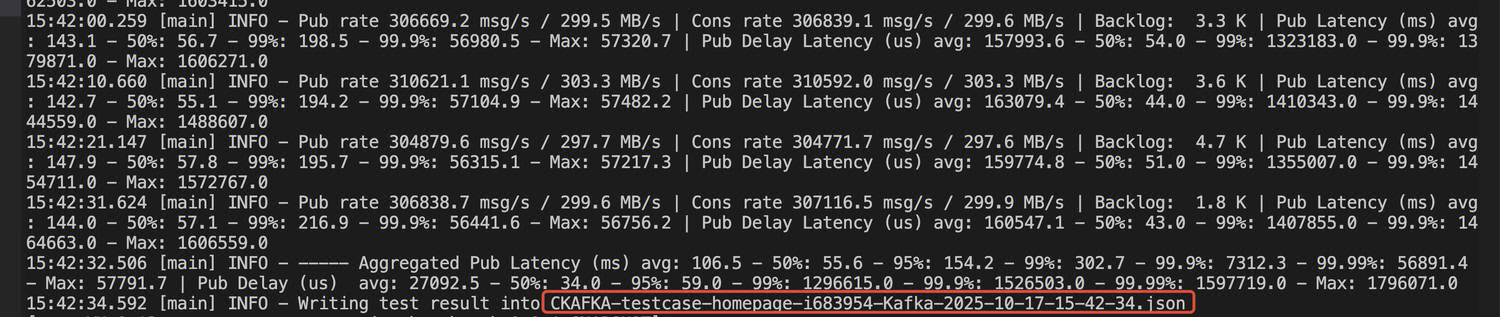 name: perftesttopics: 10partitionsPerTopic: 100 #实例总分区数/(10*2)messageSize: 1024 #不开启压缩算法时,配置为1024; 开启压缩算法参见 《3.4压缩比相关配置》payloadFile: "date.file"subscriptionsPerTopic: 1consumerPerSubscription: 120producersPerTopic: 100 #实例为20M规格时配置为10, 其它均填100useRandomizedPayloads: truerandomBytesRatio: 0.1producerRate: 307200 #注意:producerRate=(实例带宽/2)*1024consumerBacklogSizeGB: 0testDurationMinutes: 30randomizedPayloadPoolSize: 100keyDistributor: RANDOM_NANO